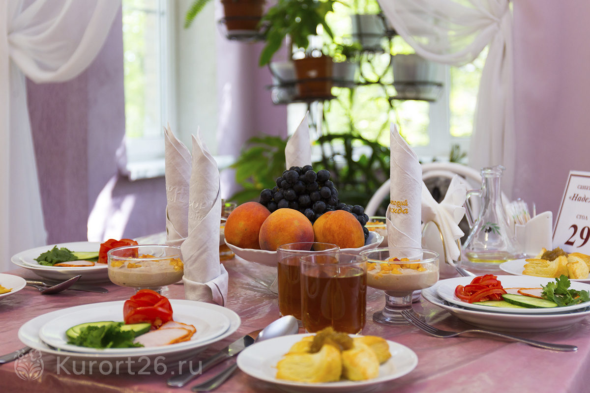 В санаторий «Надежда» лечащий врач подберёт для вас одну из 15 основных диет Певзнера. Питание 4-х разовое, на заказ по меню. В санатории вас будут кормить блюдами из диетического мяса, птицы и рыбы, свежими фруктами и овощами, молочными кашами, творожными запеканками, десертами. Вам будут круглосуточно доступны натуральные соки и витаминизированные напитки.