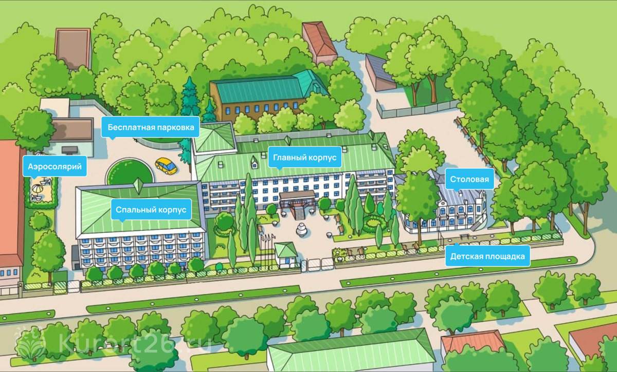 - Расположен в центре курортной зоны, между двумя парками — Курортным парком (400 м) и Парком Победы (480 м). В 3-х минутах прогулки находится бювет «Источник № 4»