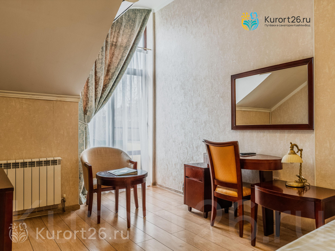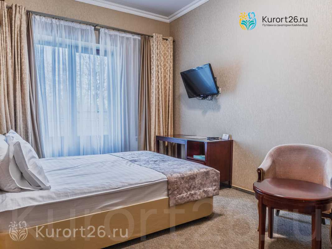 Окна номеров пансионата «Plaza Essentuki» выходят на лечебный парк или на Театральную площадь с фонтанами и видом на Эльбрус. В большинстве номеров есть балконы с плетеной мебелью.