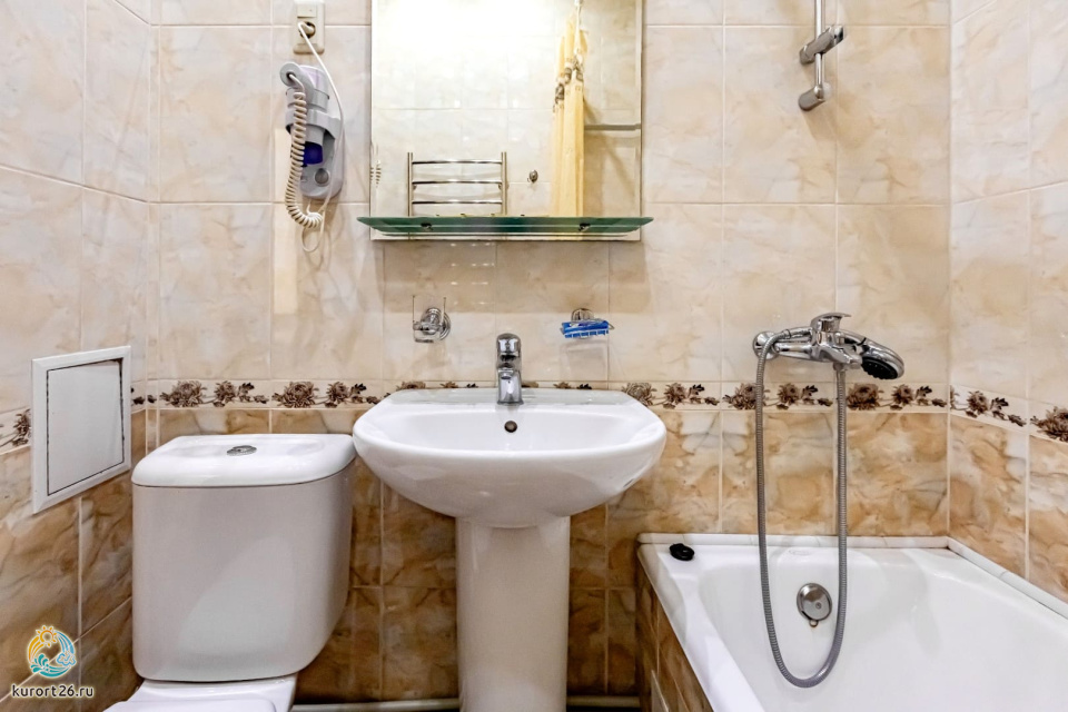 холодильник, кондиционер, фен, набор чайной посуды, утюг, балкон, сейф, ванные принадлежности, электрочайник, ванная комната, два телевизора