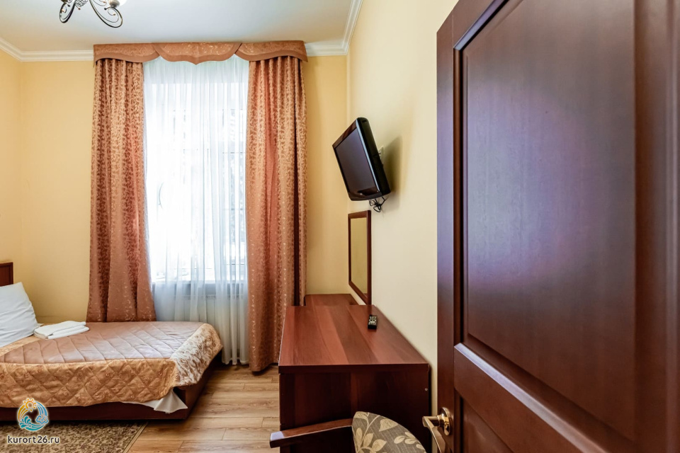 холодильник, телевизор, фен, телефон, односпальная кровать, набор полотенец