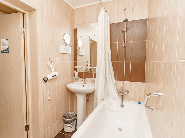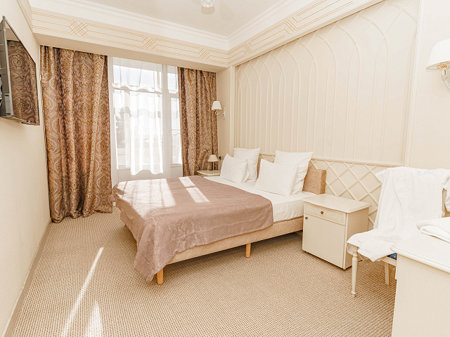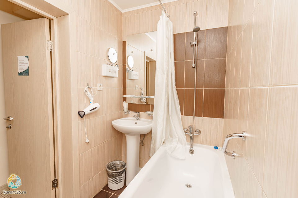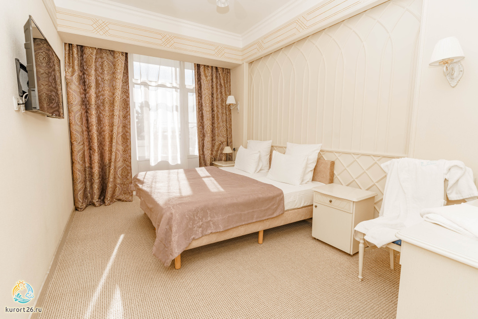 холодильник, кондиционер, телевизор, фен, набор чайной посуды, сейф, телефон, ванные принадлежности, халат, тапочки, двуспальная кровать, электрочайник, ванная комната