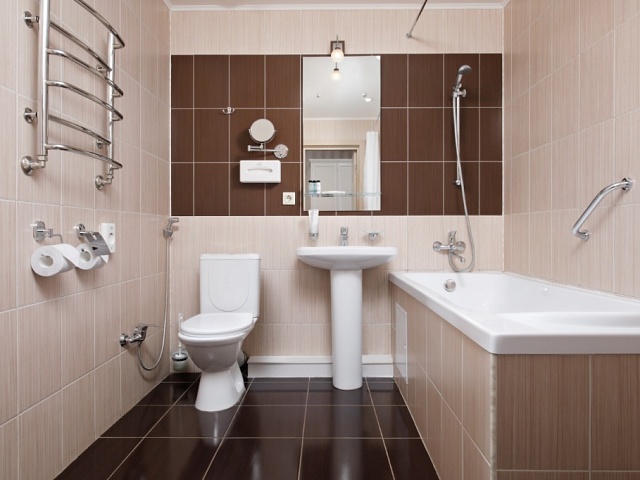 холодильник, кондиционер, телевизор, фен, набор чайной посуды, сейф, телефон, ванные принадлежности, халат, тапочки, двуспальная кровать, электрочайник, ванная комната