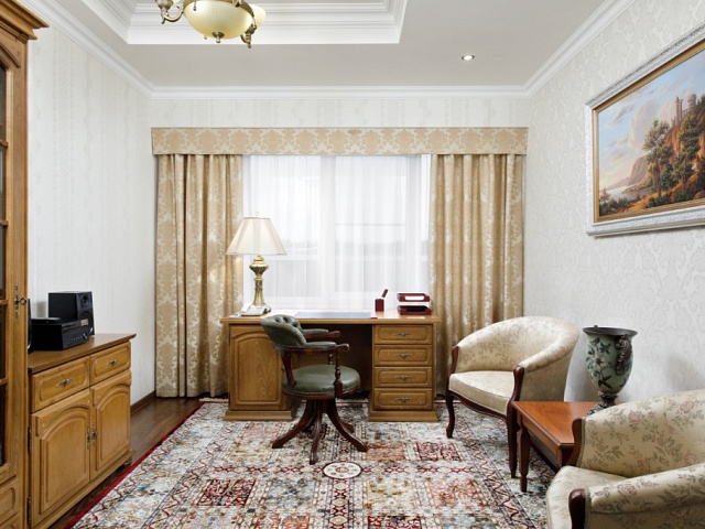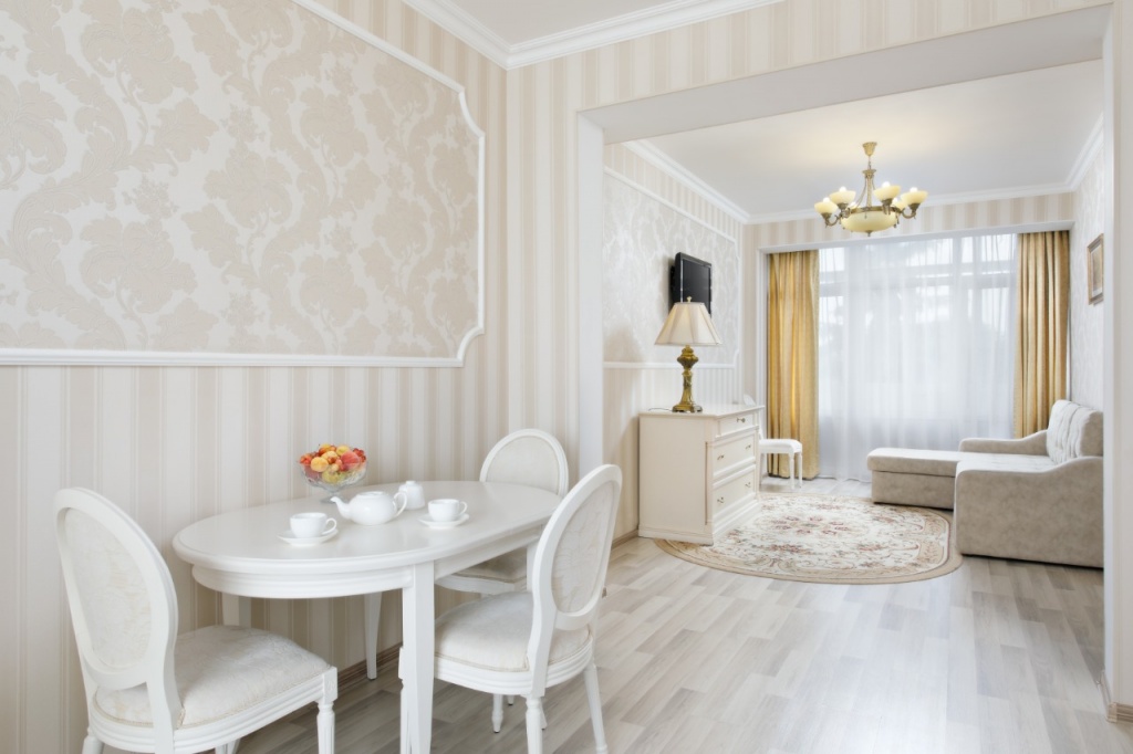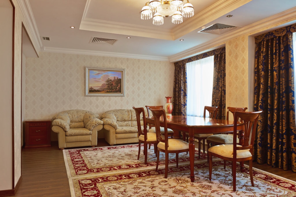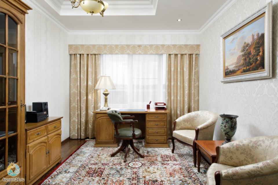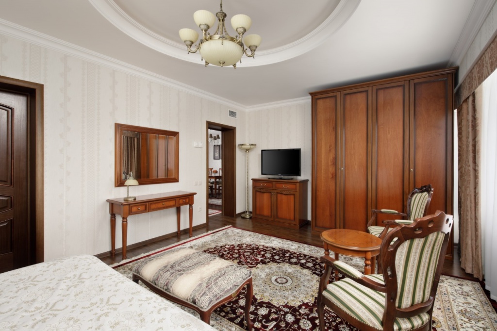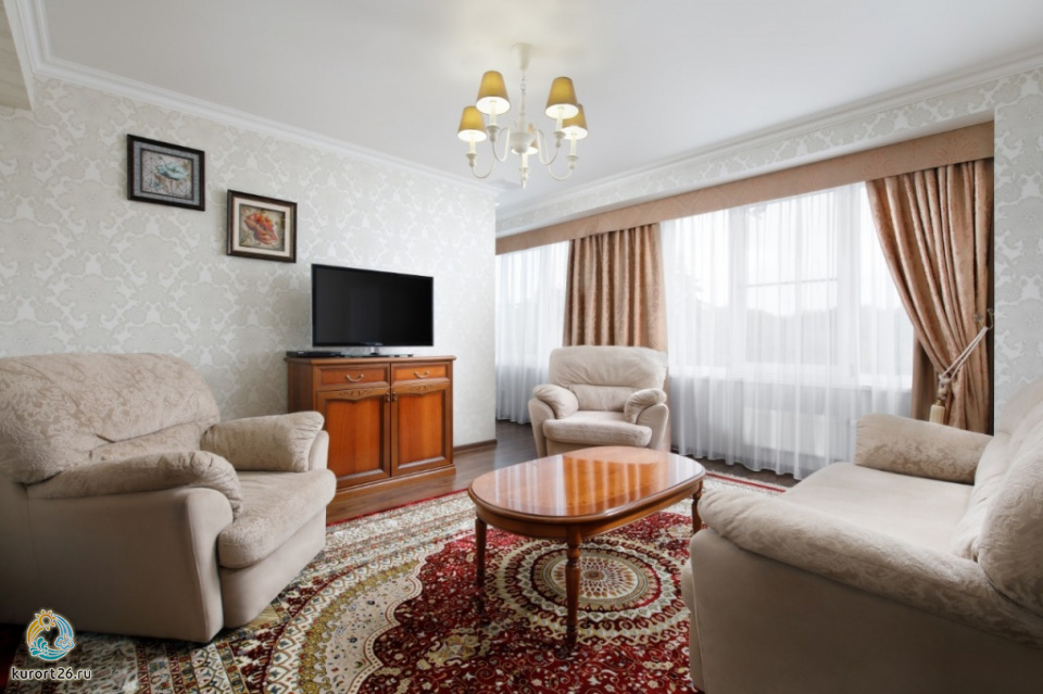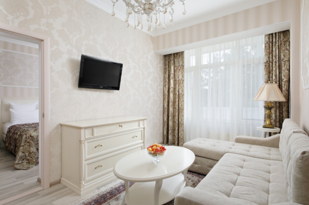 холодильник, кондиционер, телевизор, чайник, фен, набор чайной посуды, балкон, сейф, ванные принадлежности, халат, тапочки, двуспальная кровать, набор мягкой мебели, прикроватные тумбочки, обеденный стол, ванная комната