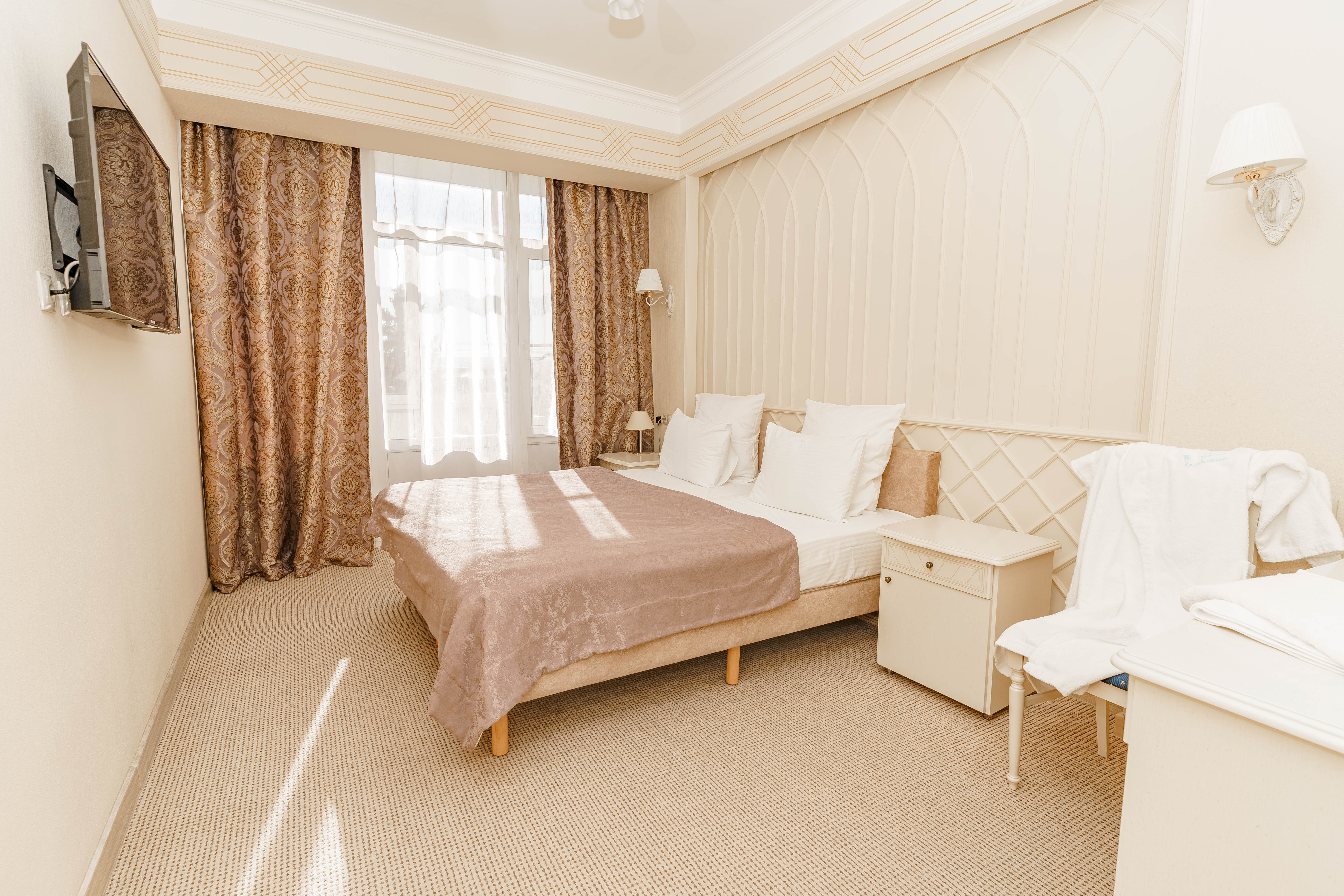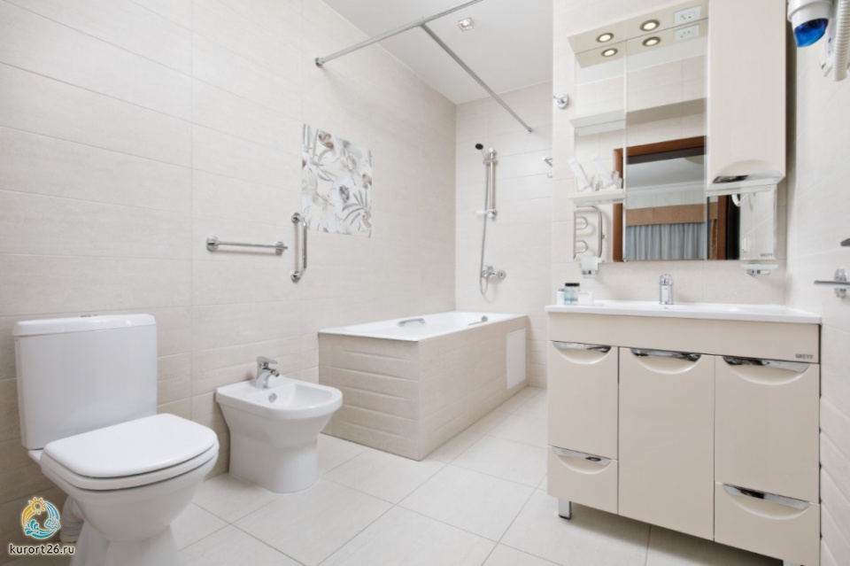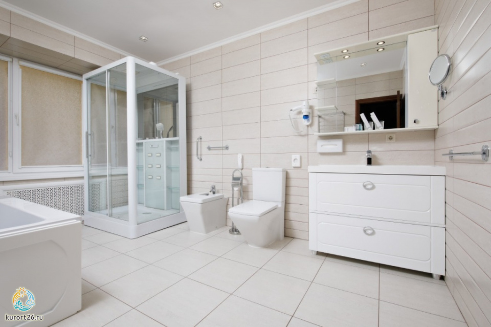холодильник, кондиционер, телевизор, фен, набор чайной посуды, сейф, телефон, ванные принадлежности, халат, тапочки, двуспальная кровать, электрочайник, ванная комната
