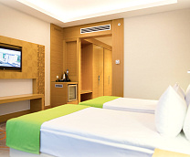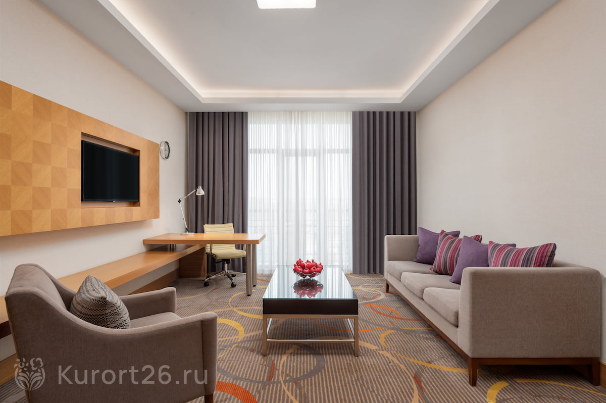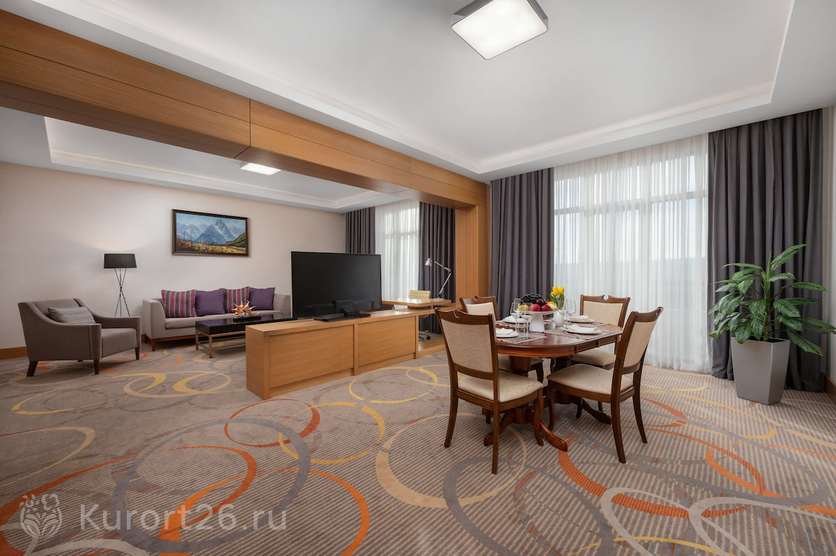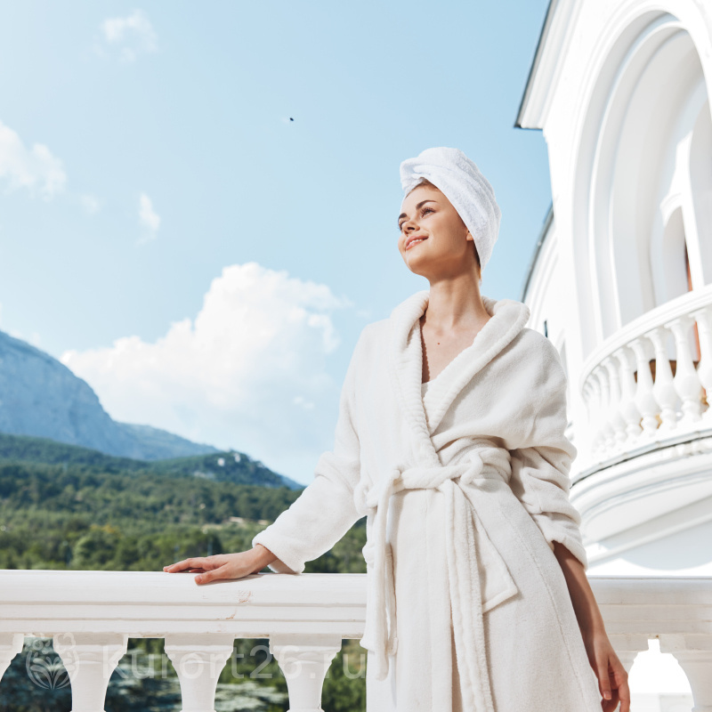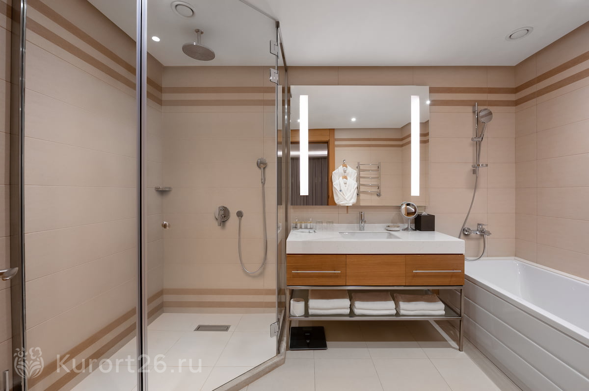 В здравнице просторные номера от 30 кв.м с панорамными окнами, системами климат-контроля и звукоизоляцией. Для комфортного сна — блэкаут-шторы, ортопедические матрасы и текстиль из гипоаллергенных материалов. В номерах — вместительные шкафы, рабочий стол, телевизор с кабельными каналами, мини-бар, чайная станция. Санузлы оснащены душевыми кабинами (в категориях «Люкс» и «Апартамент» — ваннами), комплектами банных принадлежностей, халатами, тапочками и фенами.