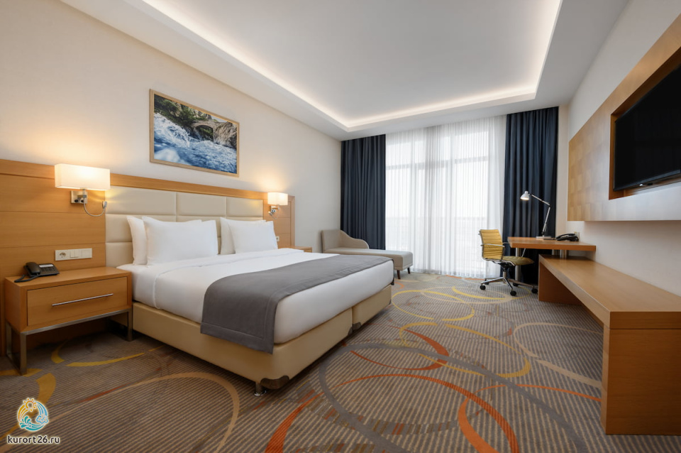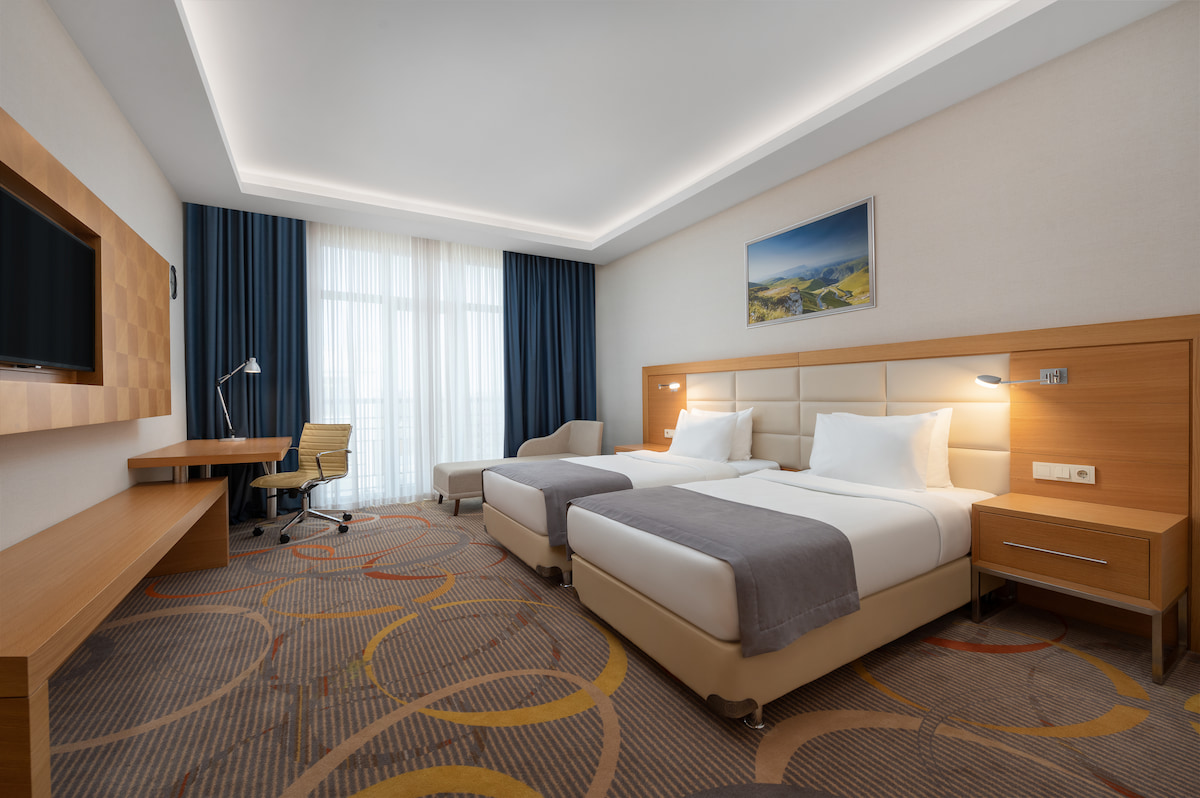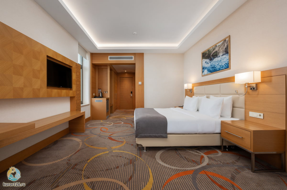 кондиционер, телевизор, фен, балкон, сейф, телефон, мини-бар, санузел с душевой кабиной, ванные принадлежности, кровати с ортопедическими матрацами, халат, тапочки, электрочайник, кресло-кровать, Рабочая зона с письменным столом и удобным стулом, чайный набор