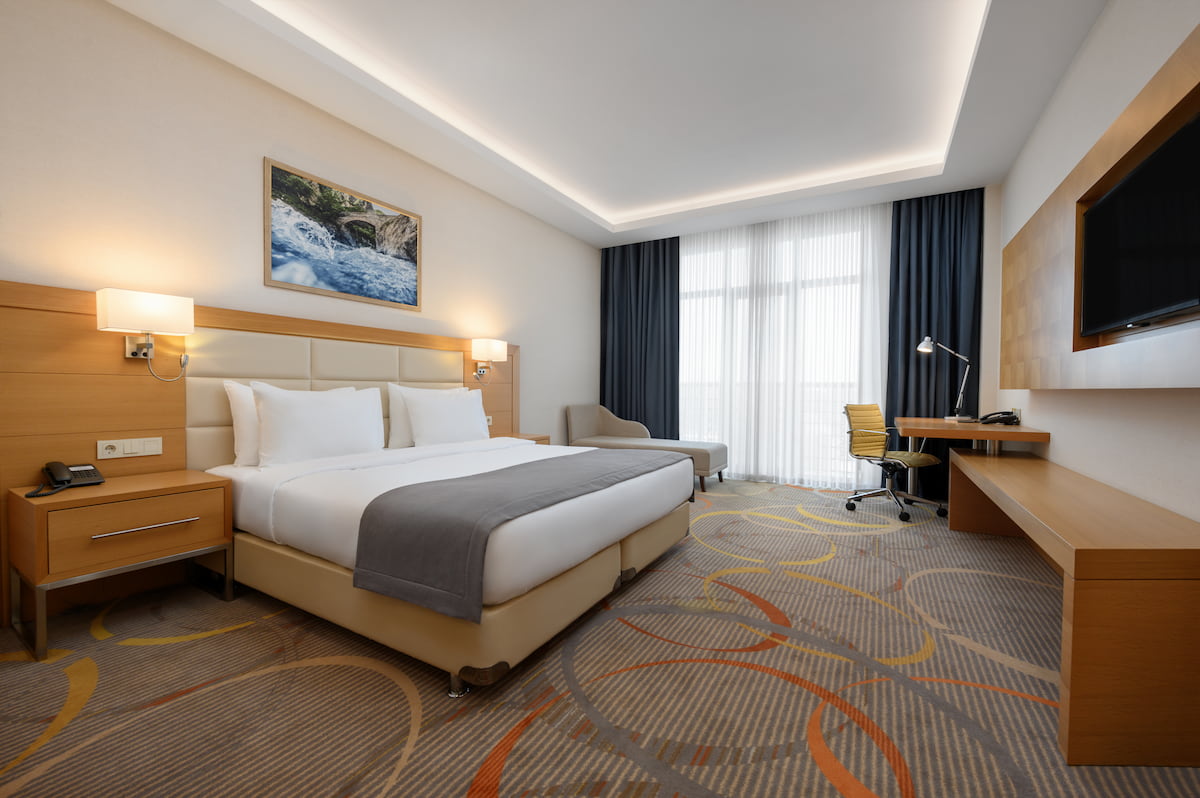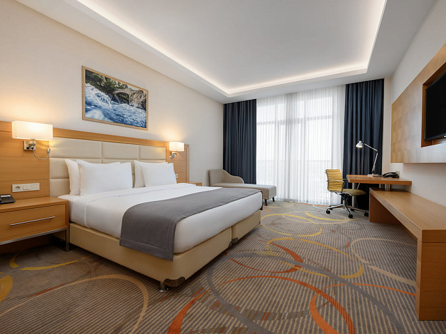кондиционер, телевизор, фен, балкон, сейф, телефон, мини-бар, ванные принадлежности, халат, тапочки, электрочайник, кресло-кровать, двуспальная кровать с ортопедическим матрасом, Рабочая зона с письменным столом и удобным стулом, Душевая кабина, чайный набор