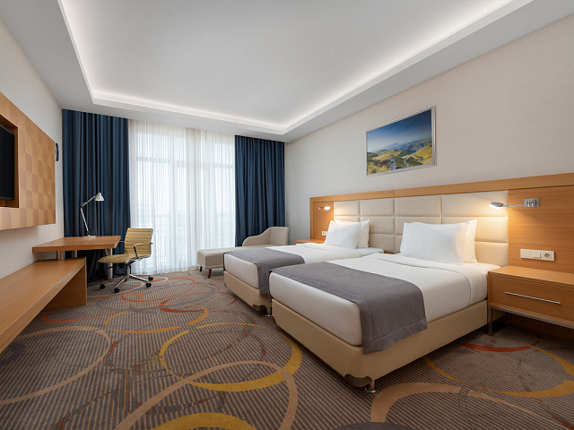кондиционер, телевизор, фен, балкон, сейф, телефон, мини-бар, санузел с душевой кабиной, ванные принадлежности, кровати с ортопедическими матрацами, халат, тапочки, электрочайник, кресло-кровать, Рабочая зона с письменным столом и удобным стулом, чайный набор