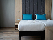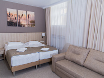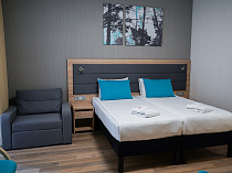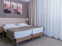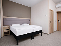 холодильник, кондиционер, телевизор, фен, сейф, душ, телефон, тапочки, халаты, две односпальные кровати