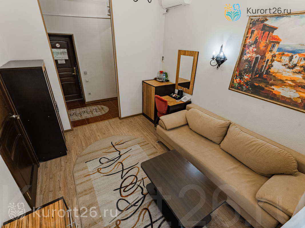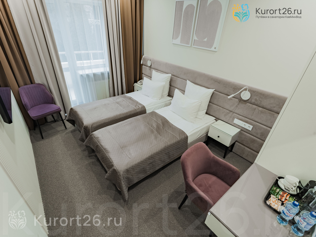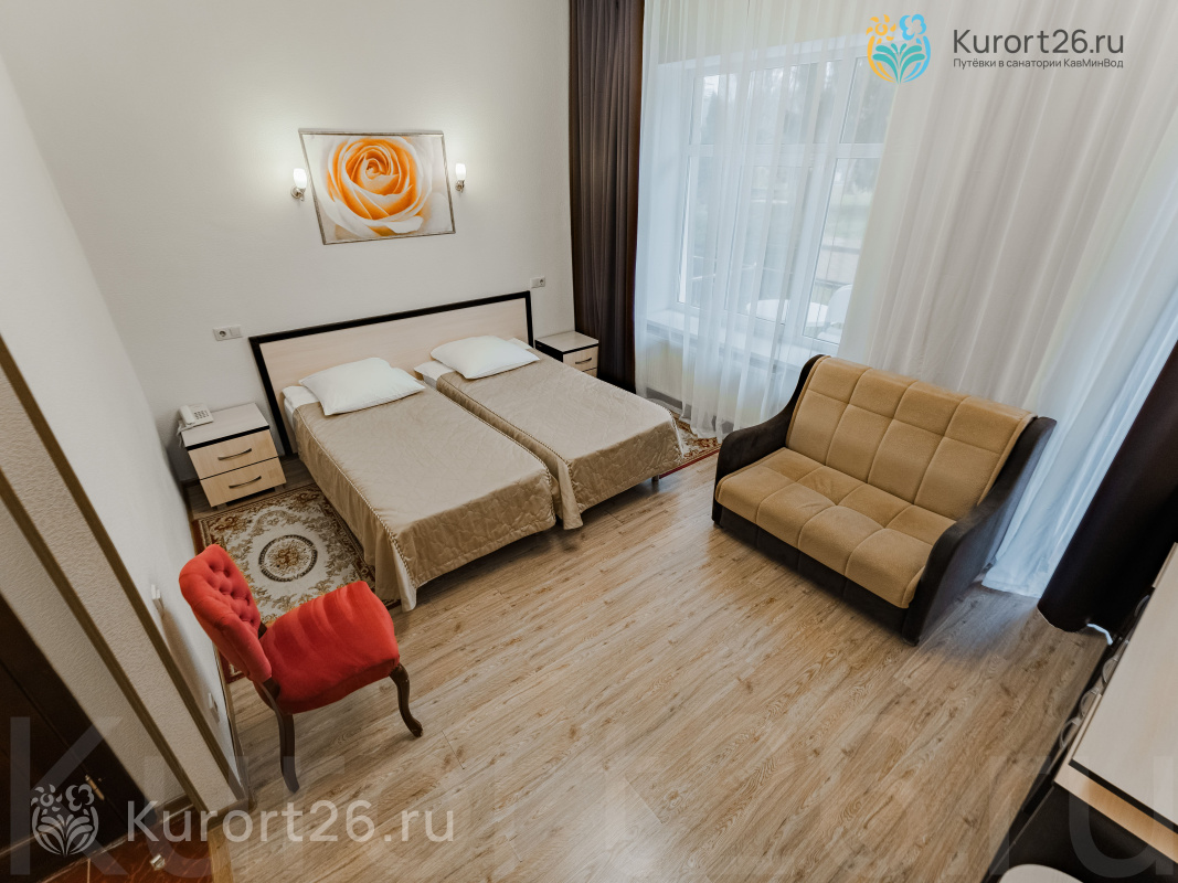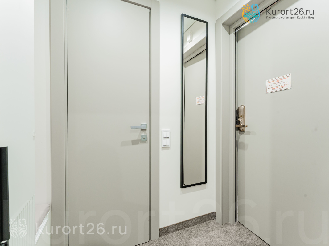 - Второй корпус — лечебный, со стандартными двухкомнатными номерами (35 кв.м) и улучшенными студиями (25 кв.м). В номерах: балкон, оборудованная ванная комната, телефон, телевизор, холодильник, фен, чайник, сейф, электронный замок.