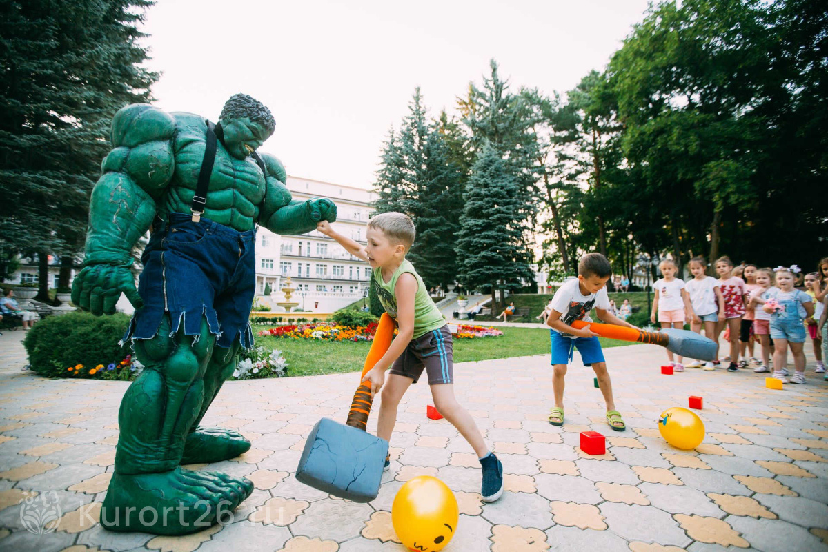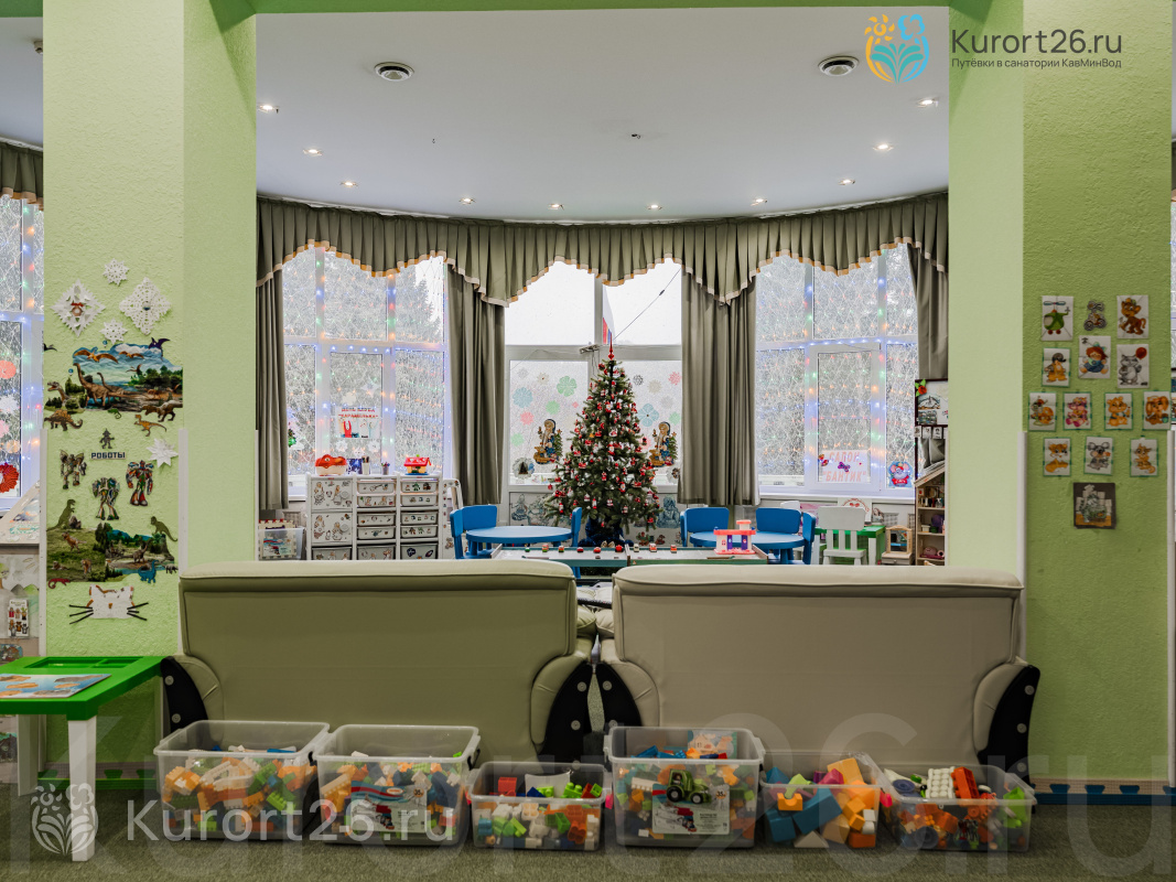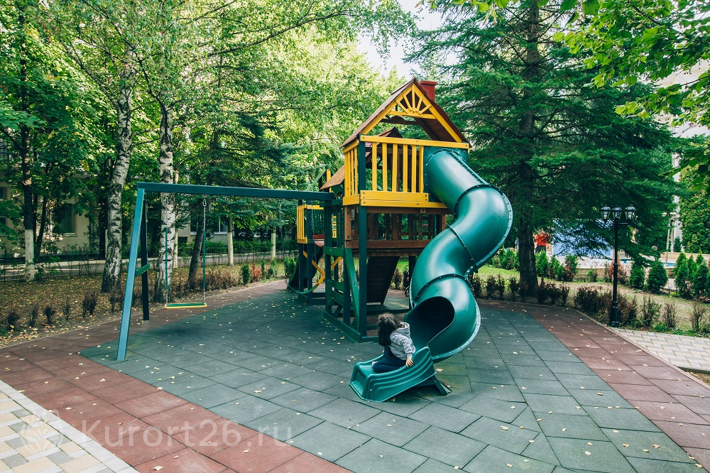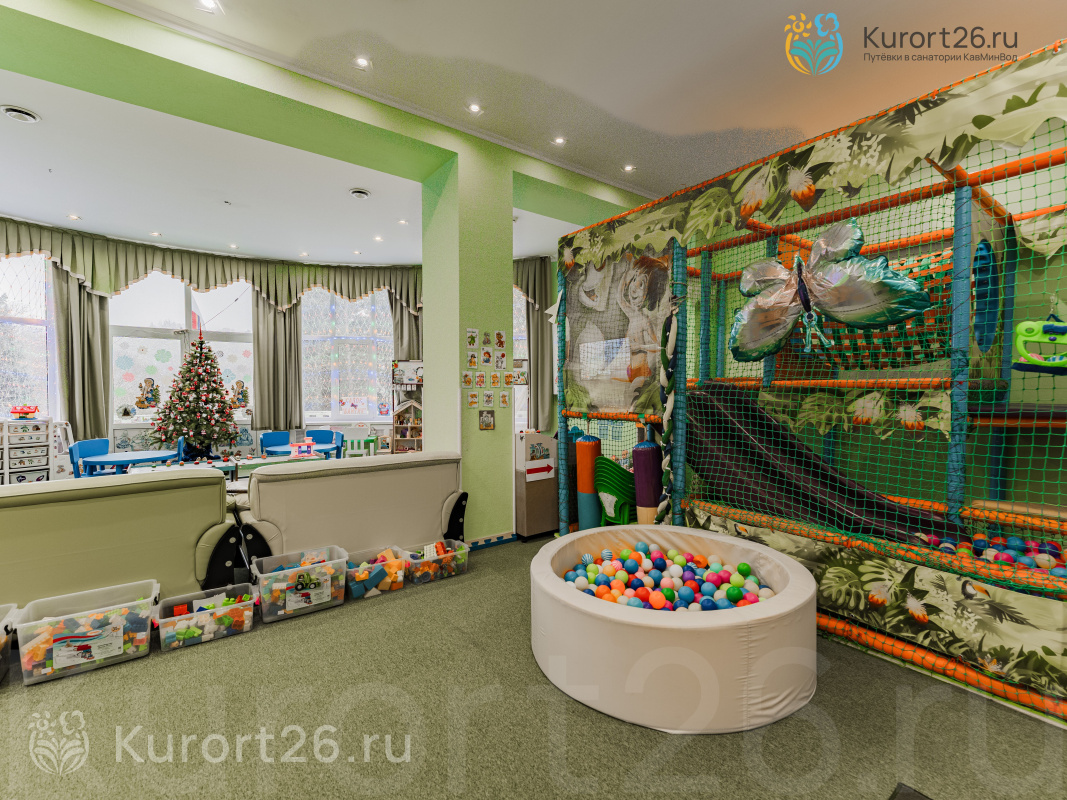 - Отдых с детьми от 2-х лет, лечение — с 4-х лет. Работает детский клуб «Карамелька», открытая детская площадка с безопасным покрытием. Ежедневная программа детской анимации, активные игры, шоу с ростовыми куклами. Рядом с санаторием расположен верёвочный городок