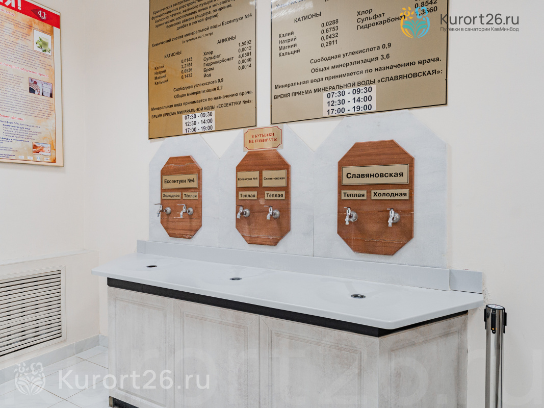 На территории санатория есть собственный бювет с минеральной водой двух курортов «Ессентуки-4» и «Славяновская» (Железноводск). До Ребровского городского бювета — 10 минут прогулки.