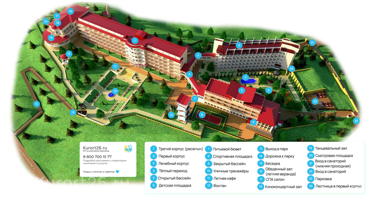 Все 3 корпуса соединены тёплыми переходами — не придётся выходить на улицу для приема процедур или посещения ресторана.