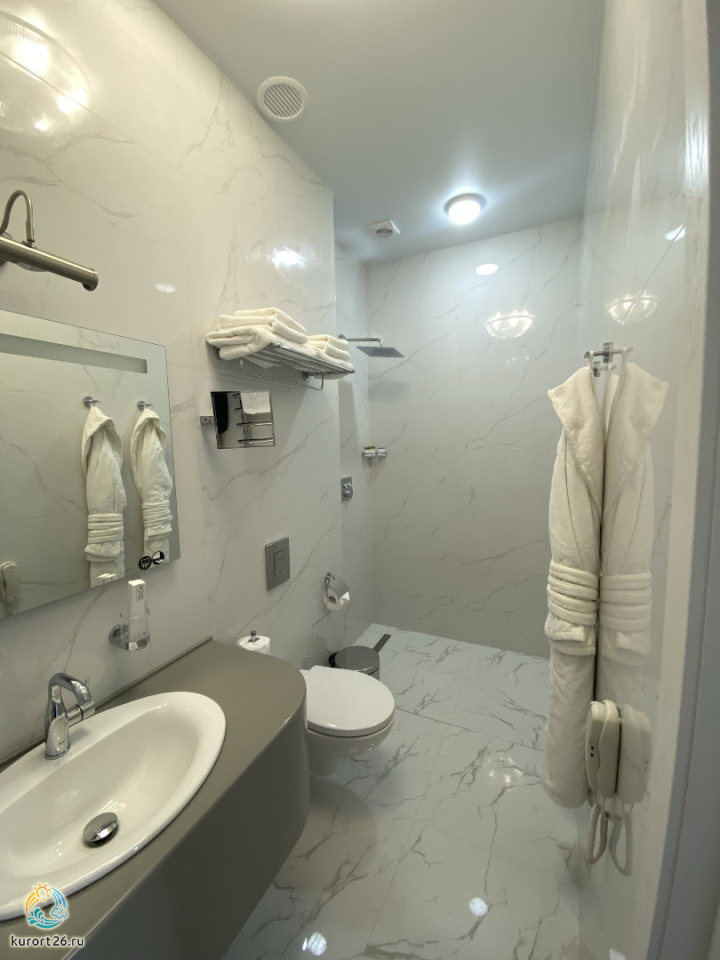 холодильник, кондиционер, телевизор, фен, сейф, телефон, санузел с душевой кабиной, халат, тапочки, утюг с гладильной доской, электрочайник