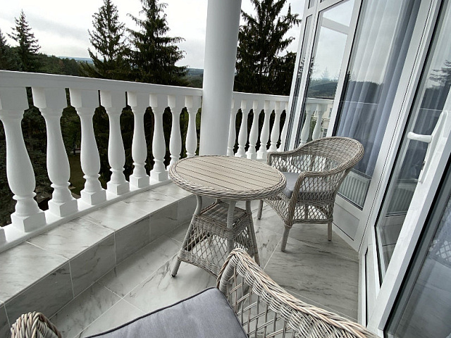 холодильник, кондиционер, чайник, фен, набор чайной посуды, утюг, балкон, ванные принадлежности, двуспальная кровать, набор мягкой мебели, прикроватные тумбочки, ванная комната, два телевизора