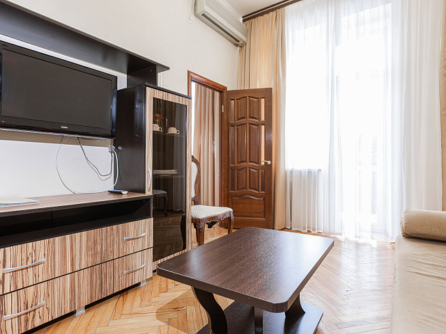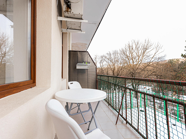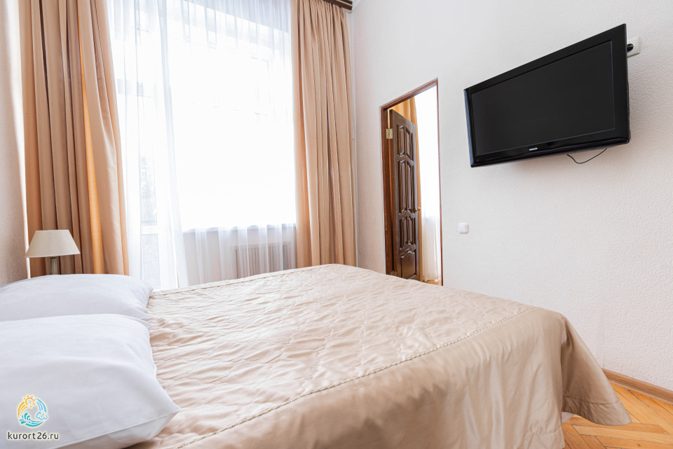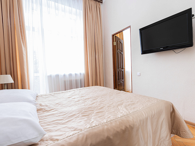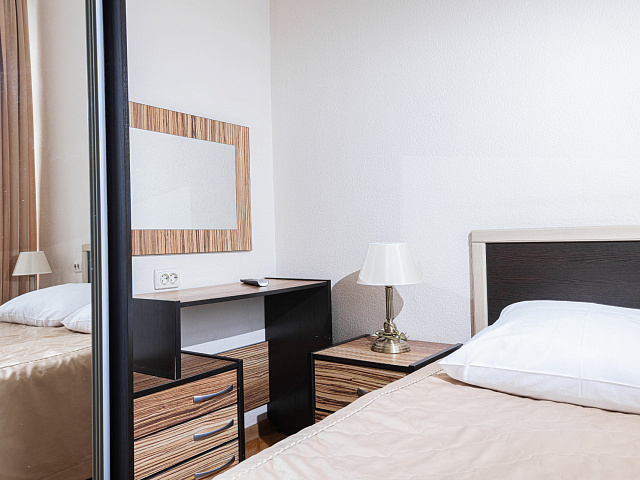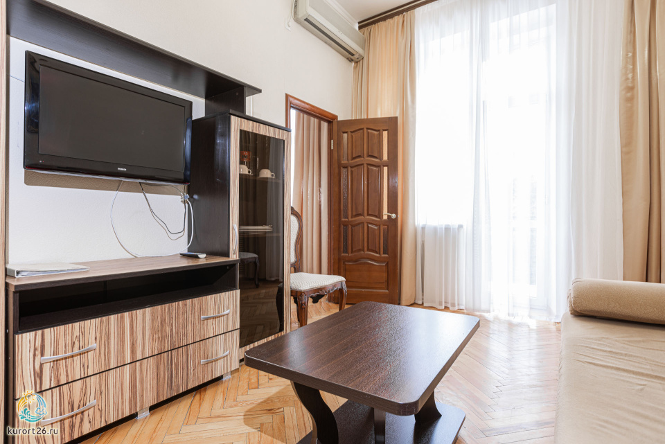 холодильник, кондиционер, чайник, фен, набор чайной посуды, утюг, балкон, ванные принадлежности, двуспальная кровать, набор мягкой мебели, прикроватные тумбочки, ванная комната, два телевизора