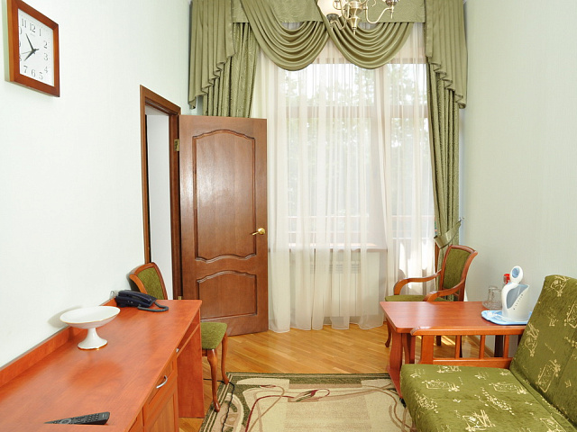 холодильник, кондиционер, телевизор, фен, сейф, телефон, санузел с душевой кабиной, халат, тапочки, утюг с гладильной доской, электрочайник