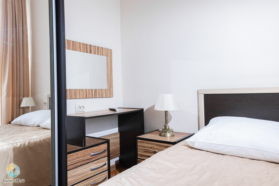 холодильник, телевизор, чайник, фен, набор чайной посуды, ванные принадлежности, прикроватные тумбочки, односпальная кровать: 2 шт, ванная комната