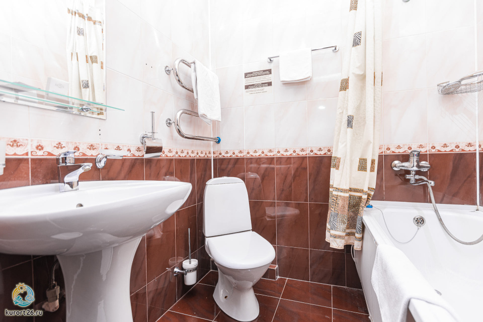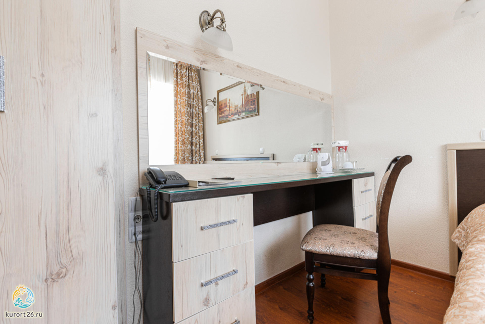 холодильник, кондиционер, телевизор, фен, сейф, телефон, санузел с душевой кабиной, халат, тапочки, утюг с гладильной доской, электрочайник