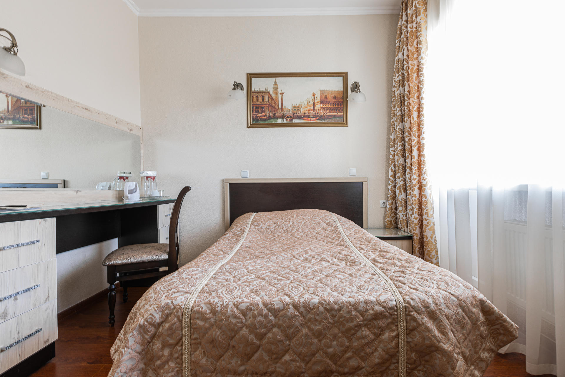 холодильник, телевизор, чайник, набор чайной посуды, балкон, душ, телефон, односпальная кровать, стол, прикроватная тумба