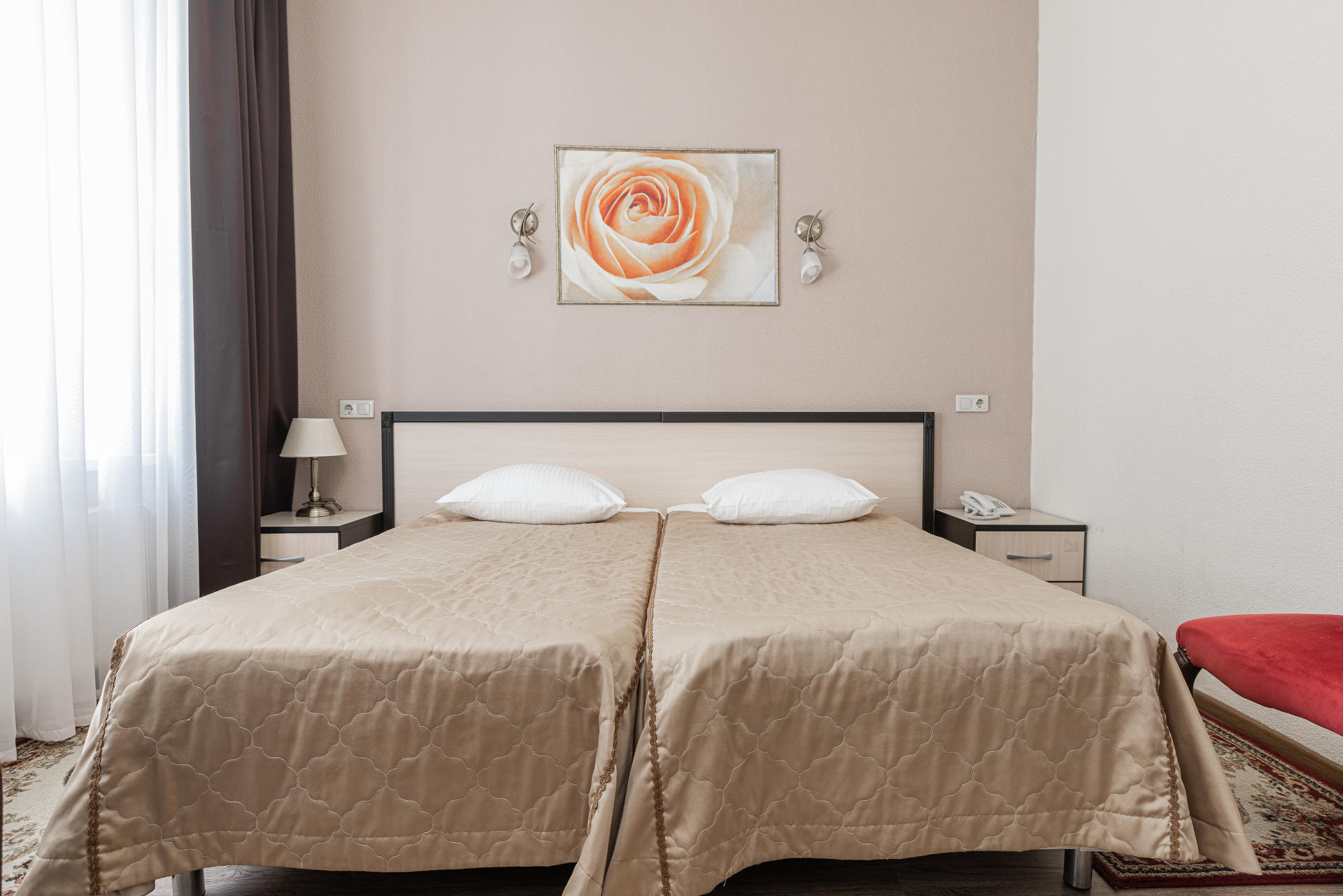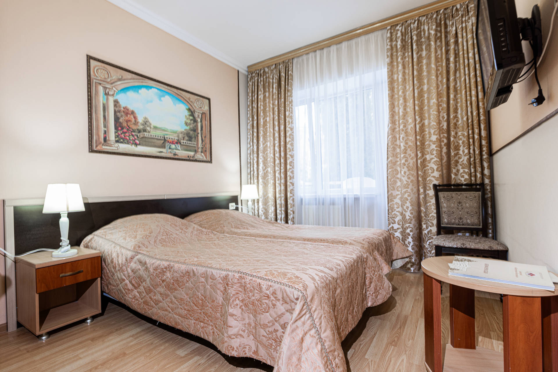 холодильник, телевизор, чайник, фен, набор чайной посуды, ванные принадлежности, прикроватные тумбочки, односпальная кровать: 2 шт, ванная комната