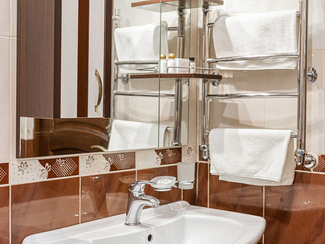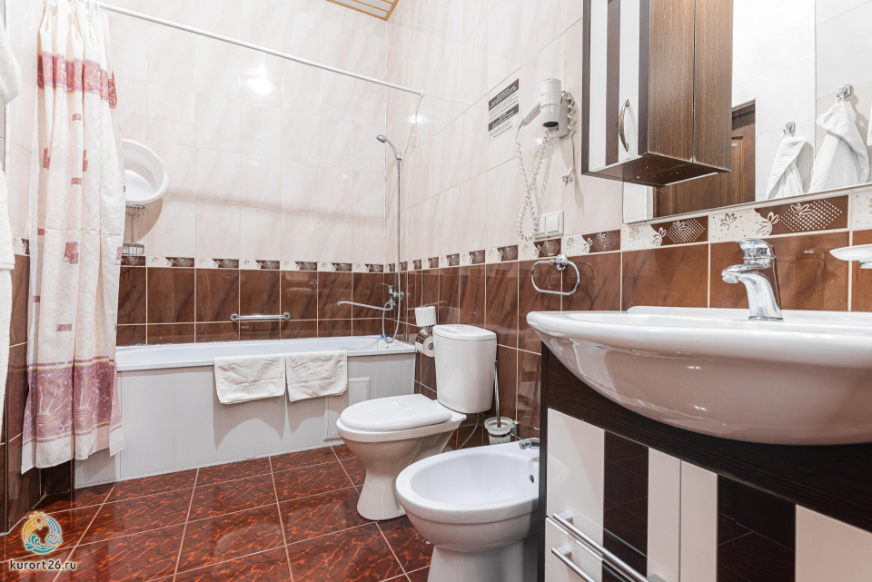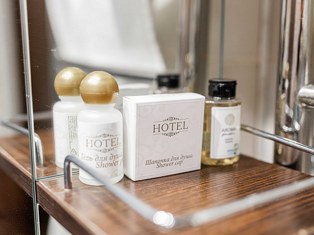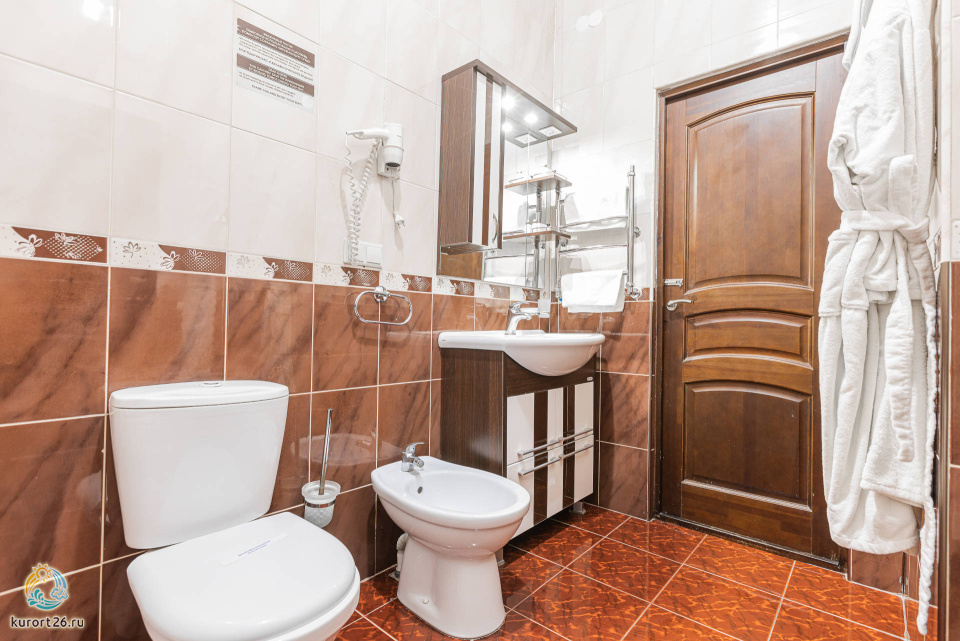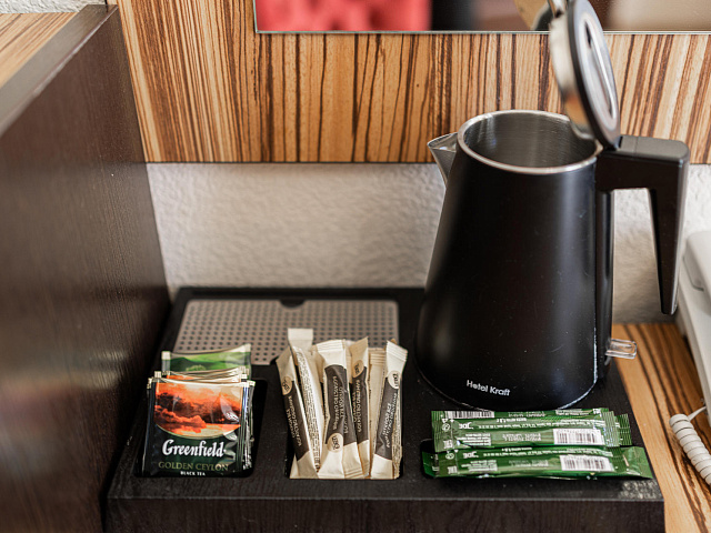 холодильник, кондиционер, телевизор, фен, сейф, телефон, санузел с душевой кабиной, халат, тапочки, утюг с гладильной доской, электрочайник