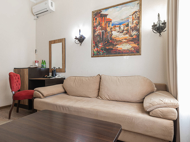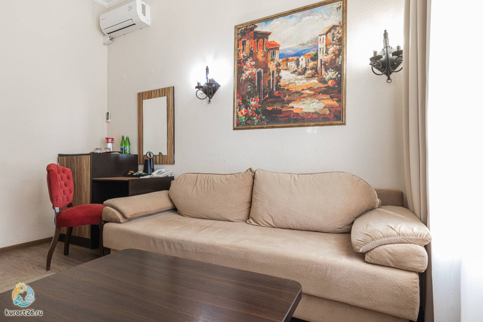 холодильник, кондиционер, чайник, фен, набор чайной посуды, утюг, балкон, ванные принадлежности, двуспальная кровать, набор мягкой мебели, прикроватные тумбочки, ванная комната, два телевизора