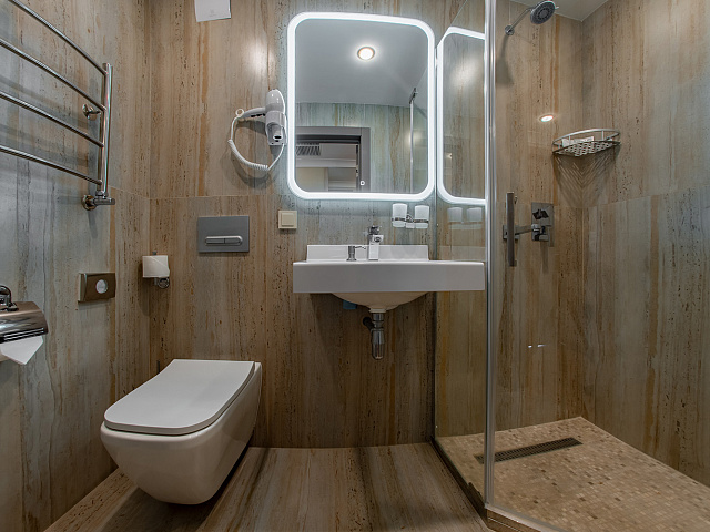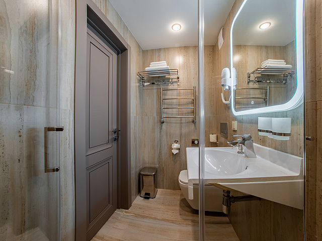холодильник, телевизор, фен, набор чайной посуды, сейф, интернет в номере, ванные принадлежности, двуспальная кровать, прикроватные тумбочки, электрочайник, стол, ванная комната, кресло, набор полотенец, Душевая кабина, гигиенические принадлежности