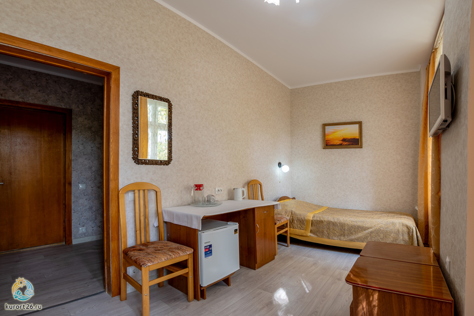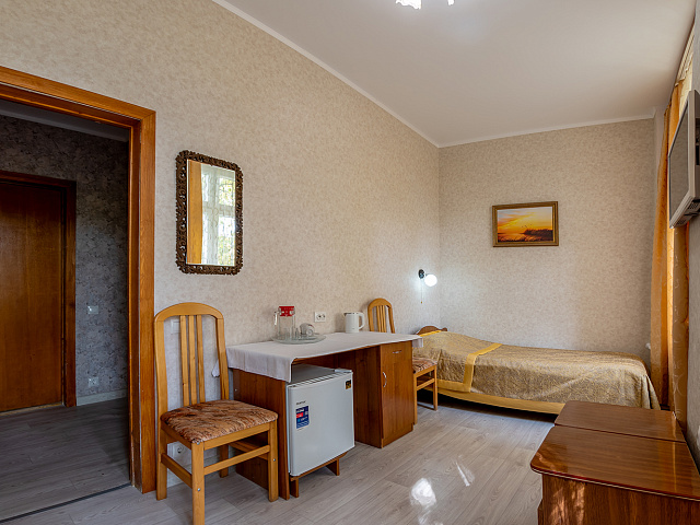 холодильник, телевизор, набор чайной посуды, балкон, интернет в номере, ванные принадлежности, шкаф, односпальная кровать, электрочайник, стол, ванная комната, кресло