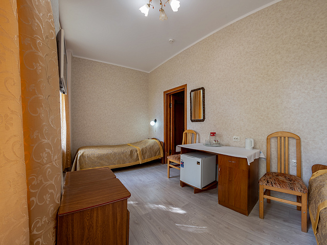 холодильник, телевизор, чайник, фен, набор чайной посуды, телефон, интернет в номере, санузел с душевой кабиной, шкаф, прикроватные тумбочки, стол, набор полотенец, две односпальные кровати, Душевая кабина, гигиенические принадлежности