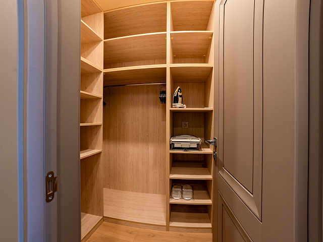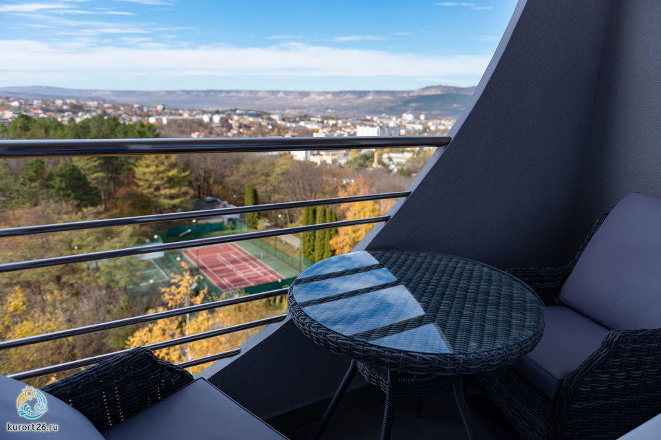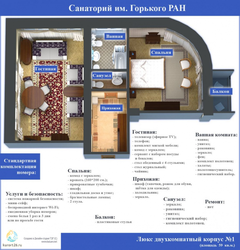 холодильник, телевизор, чайник, набор чайной посуды, балкон, сейф, телефон, интернет в номере, ванные принадлежности, двуспальная кровать, шкаф, набор мягкой мебели, прикроватные тумбочки, утюг с гладильной доской, электрочайник, стол, два санузла с ванной/душем, набор уличной мебели, журнальный столик, посуда, набор полотенец, гигиенические принадлежности
