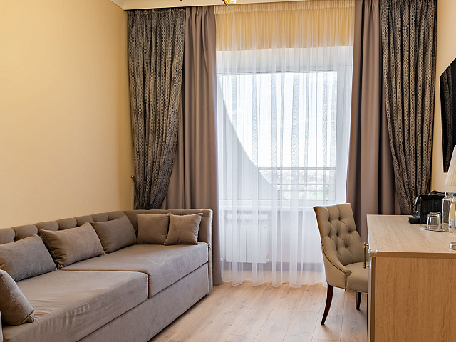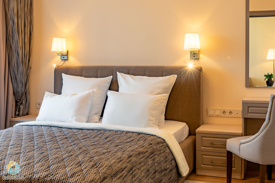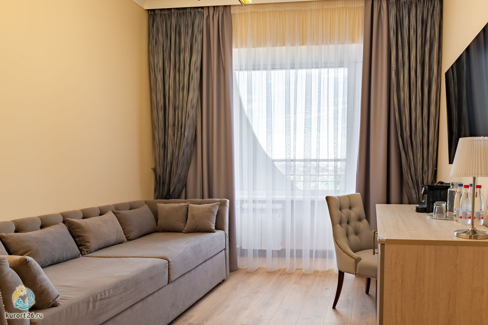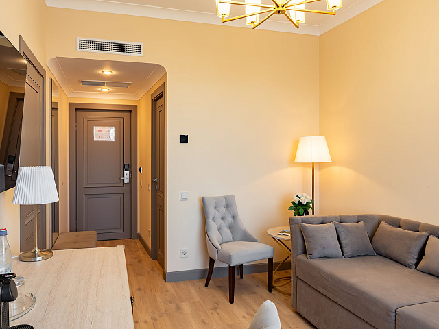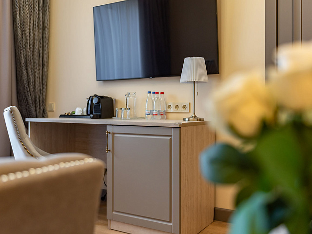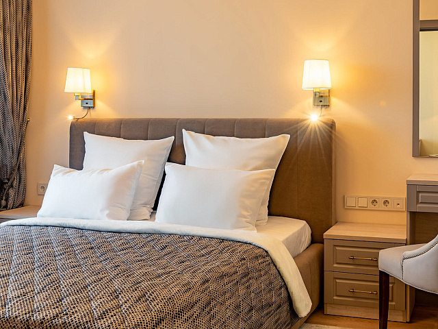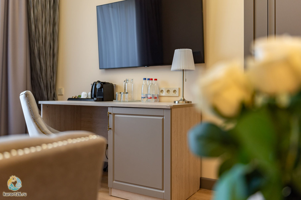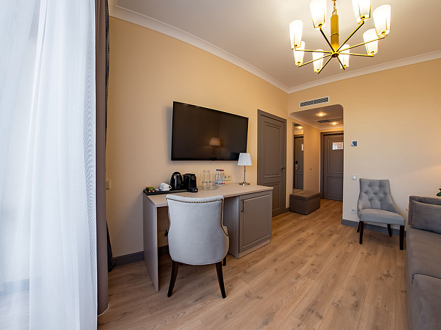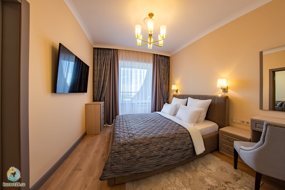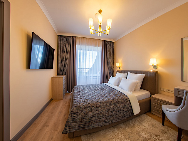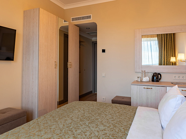 холодильник, кондиционер, телевизор, чайник, фен, телефон, интернет в номере, двуспальная кровать, прикроватные тумбочки, шкаф-купе, мягкая мебель, обеденный стол, утюг с гладильной доской, ванна, посуда, халаты, набор полотенец, Гигиенический душ, гигиенические принадлежности