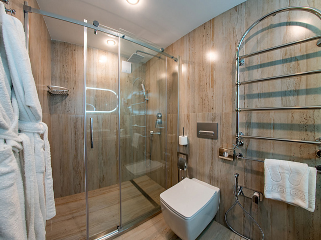 холодильник, кондиционер, телевизор, фен, набор чайной посуды, балкон, телефон, интернет в номере, ванные принадлежности, сервант, двуспальная кровать, шкаф, набор мягкой мебели, прикроватные тумбочки, утюг с гладильной доской, электрочайник, стол, ванная комната, два санузла с ванной/душем, набор уличной мебели, журнальный столик, посуда, набор полотенец, Гигиенический душ, кухонное оборудование, гигиенические принадлежности
