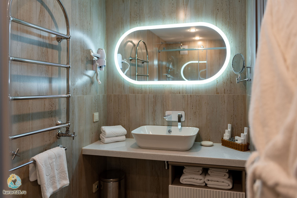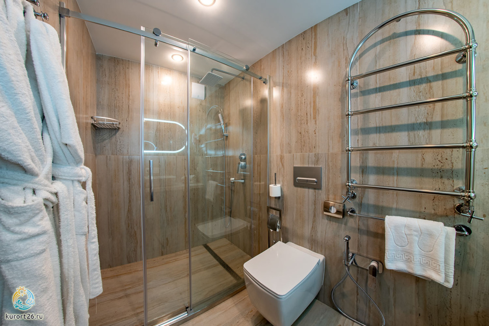 холодильник, телевизор, фен, набор чайной посуды, сейф, интернет в номере, ванные принадлежности, двуспальная кровать, прикроватные тумбочки, электрочайник, стол, ванная комната, кресло, набор полотенец, Душевая кабина, гигиенические принадлежности