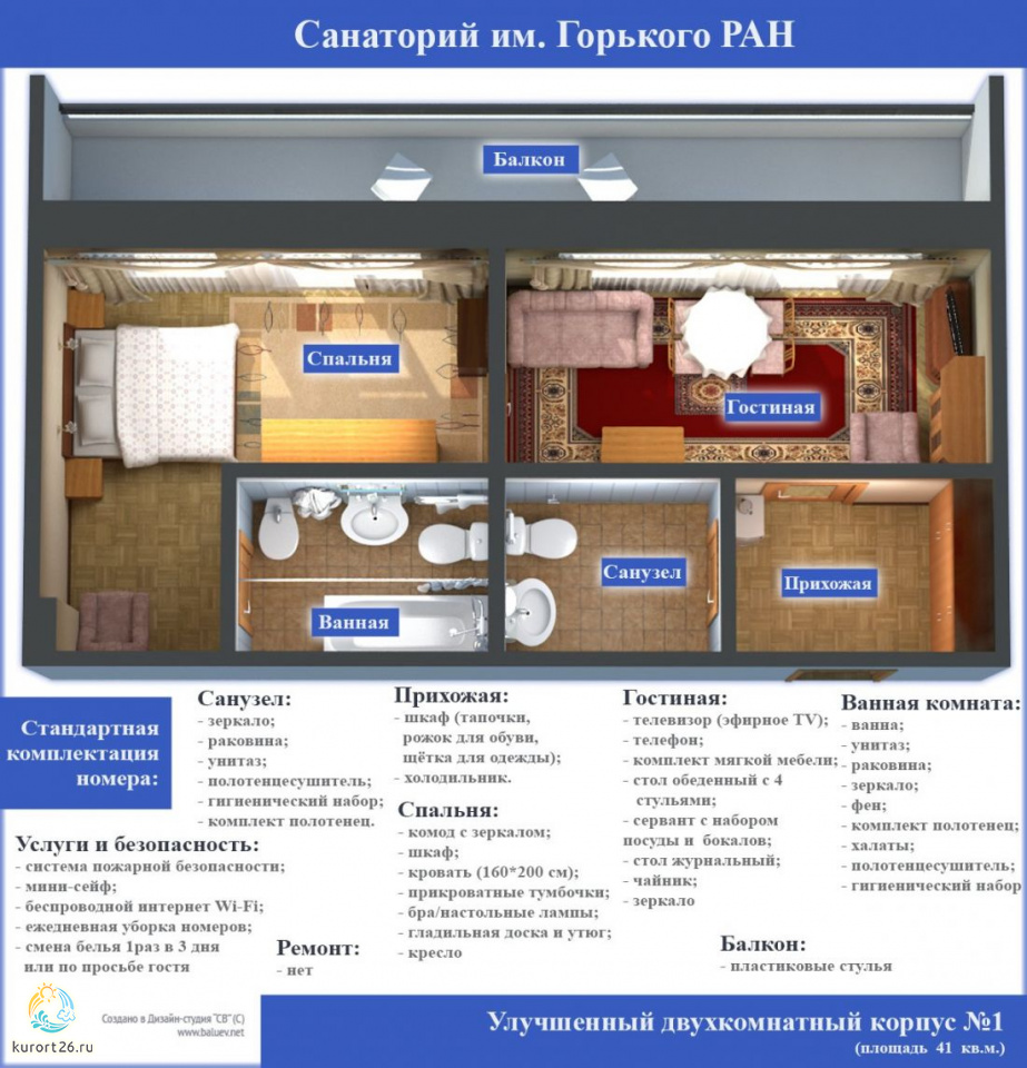 холодильник, телевизор, чайник, набор чайной посуды, балкон, сейф, телефон, интернет в номере, ванные принадлежности, двуспальная кровать, шкаф, набор мягкой мебели, прикроватные тумбочки, утюг с гладильной доской, электрочайник, стол, два санузла с ванной/душем, набор уличной мебели, журнальный столик, посуда, набор полотенец, гигиенические принадлежности
