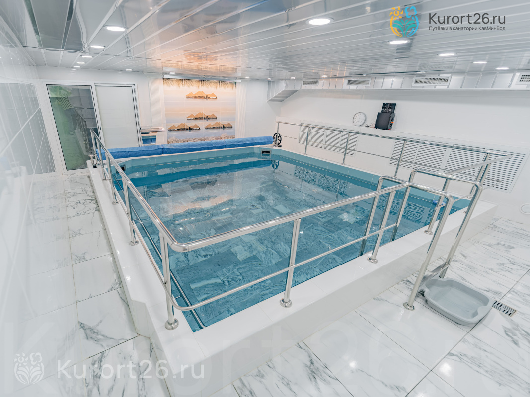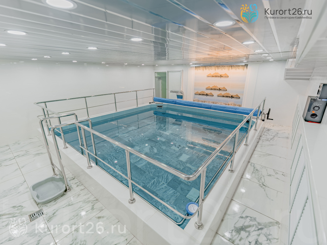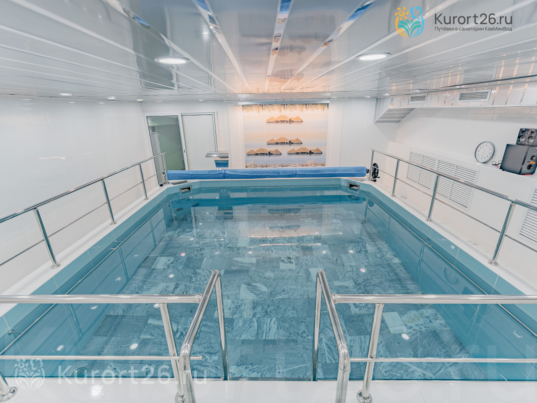 - Крытый бассейн 5×4 метра с водопадом. В бассейне проводятся занятия ЛФК и аквааэробикой