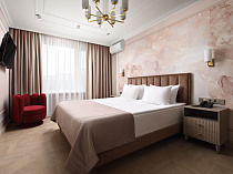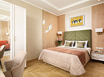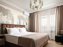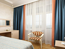 холодильник, телевизор, чайник, фен, сейф, телефон, интернет в номере, мини-бар, санузел с душевой кабиной, ванные принадлежности, халат, тапочки, двуспальная кровать, набор мягкой мебели, электрочайник, сплит-система, чайный набор, швейный набор