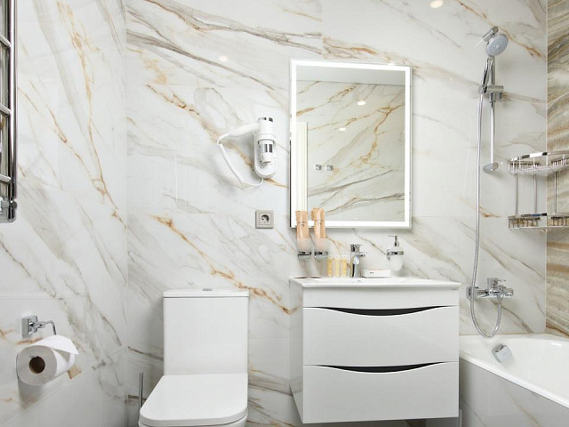 холодильник, телевизор, чайник, фен, сейф, телефон, интернет в номере, мини-бар, санузел с душевой кабиной, ванные принадлежности, халат, тапочки, двуспальная кровать, набор мягкой мебели, электрочайник, сплит-система, чайный набор, швейный набор