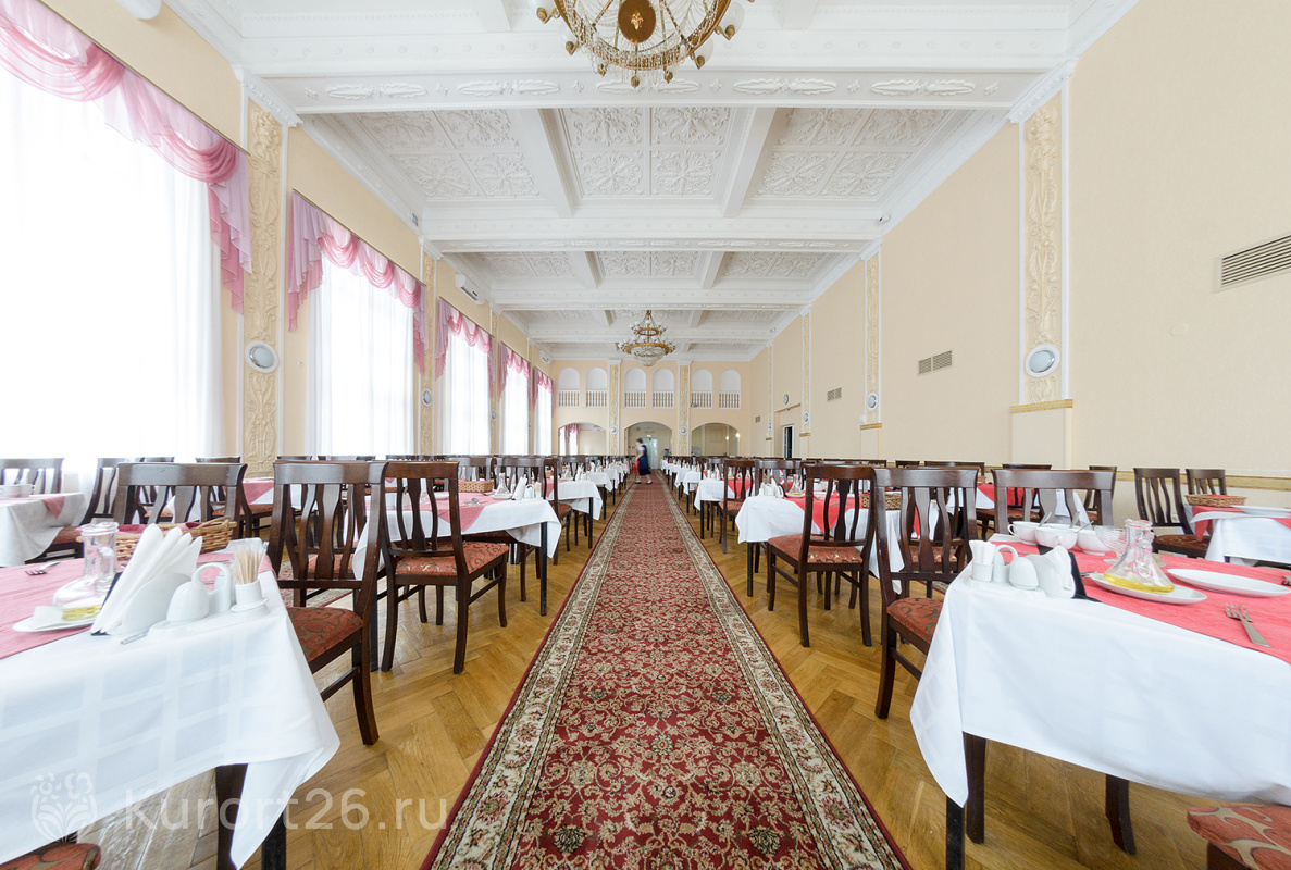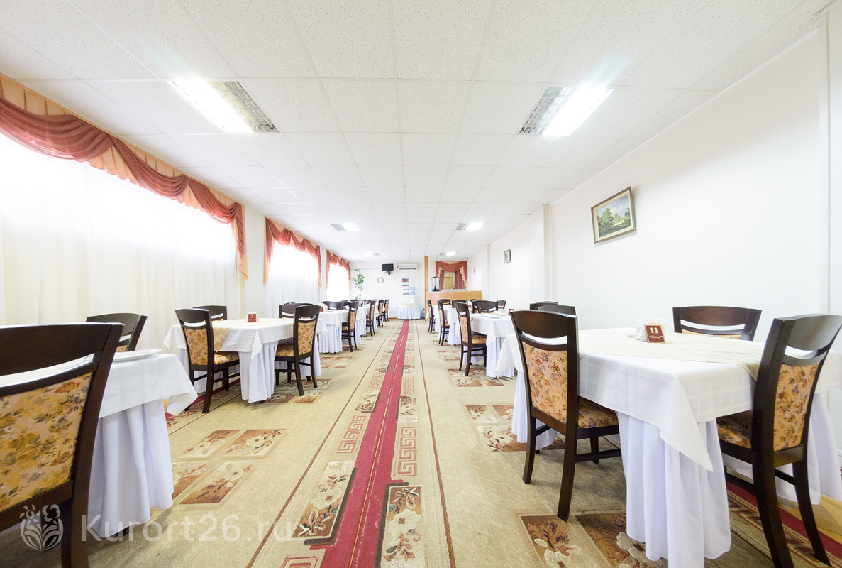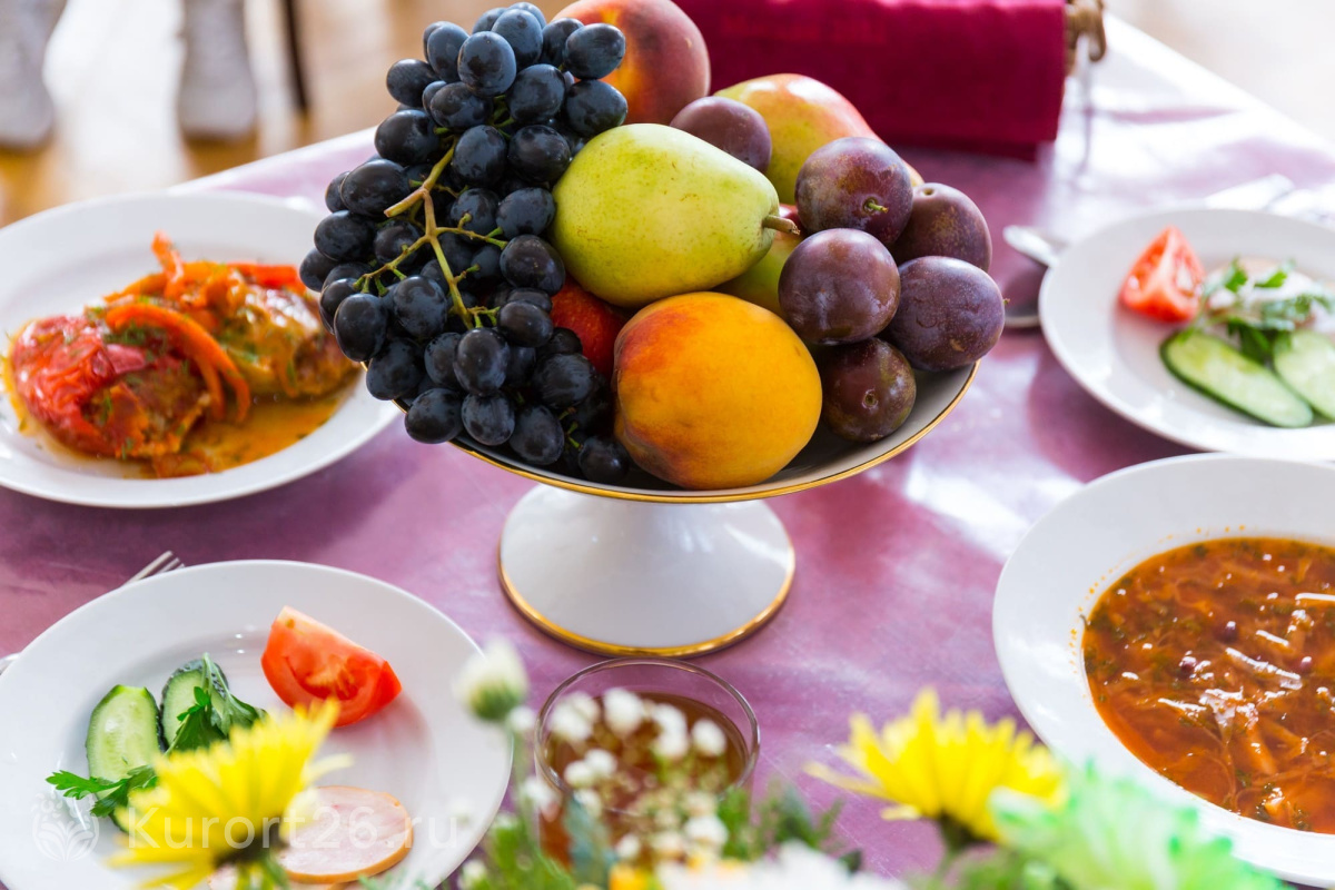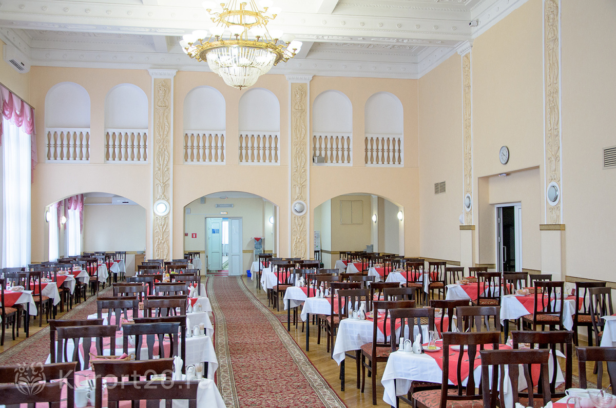 В санатории трёхразовое питание по системе «шведский стол» — для гостей, проживающих в первой, второй и третьей категориях номеров, а также «Меню–заказ» — для гостей, проживающих в категории «Люкс». Дополнительно отдыхающие получают вечерний кефир, который можно забрать с собой в номер. По необходимости лечащий врач может назначить вам одну из 15 диет Певзнера.