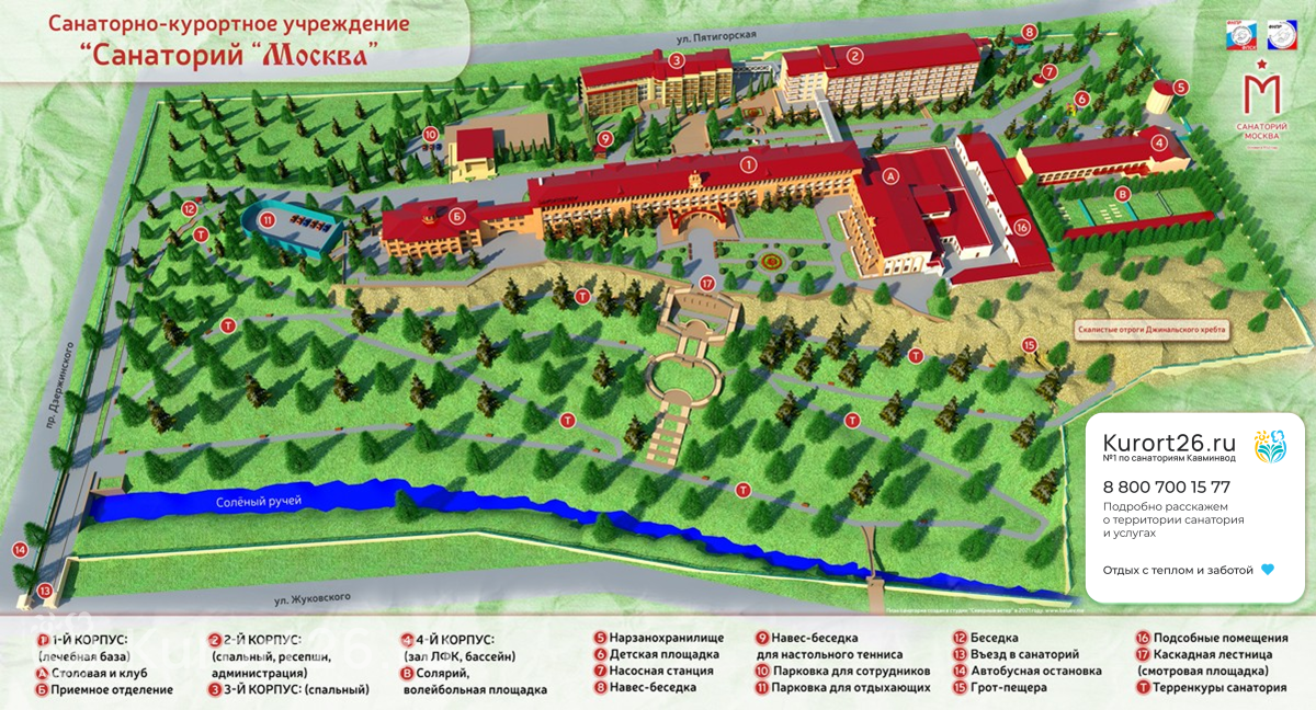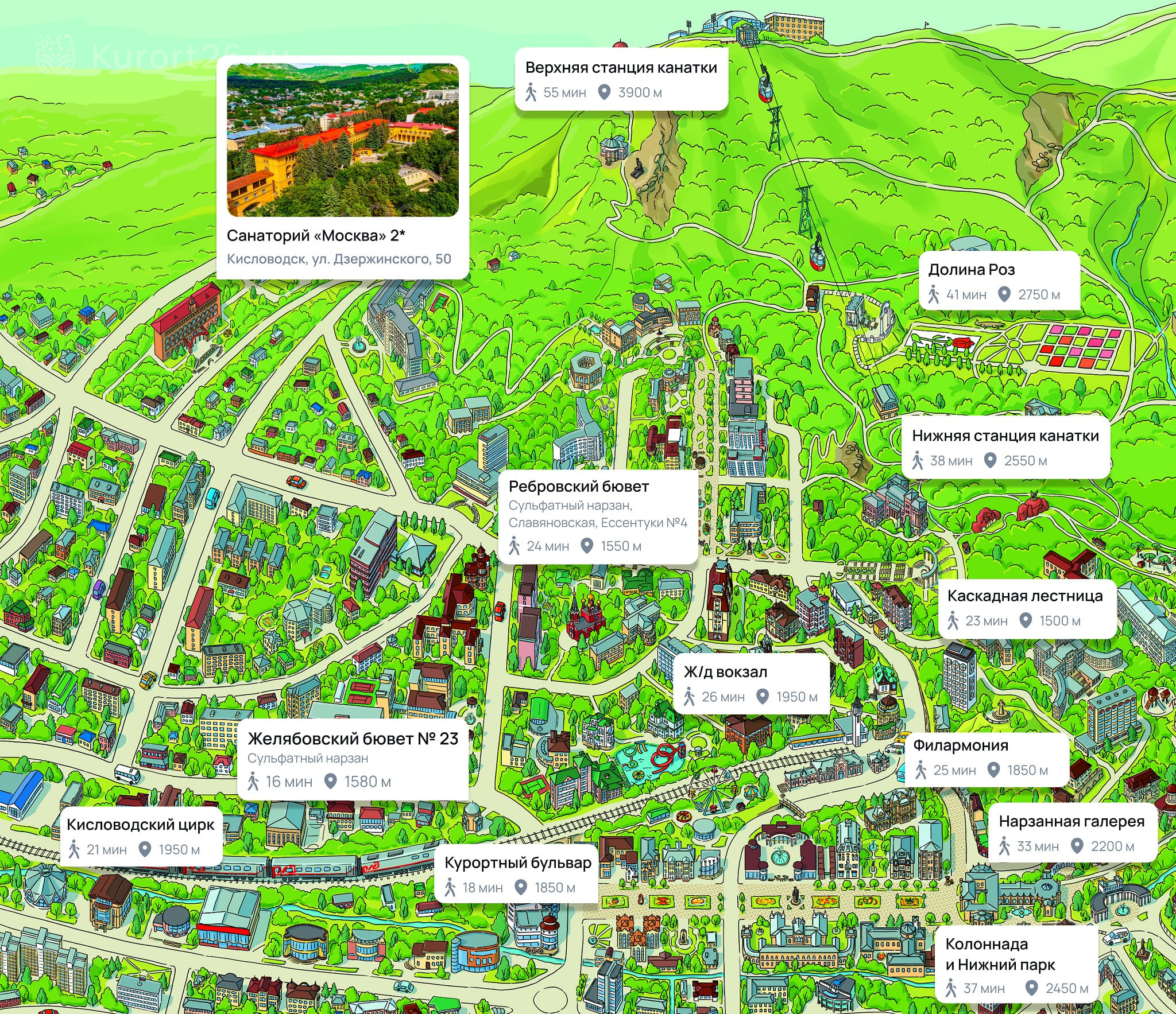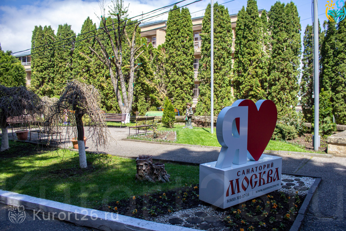 Санаторий «Москва» расположен в 3 километрах от центра Кисловодска. Территория санатория — это 9 гектаров собственного разноуровневого парка. Там проходят дорожки прогулочных маршрутов протяжённостью в полтора километра. Они позволяют совершать длительные пешие прогулки, не покидая охраняемой территории санатория.