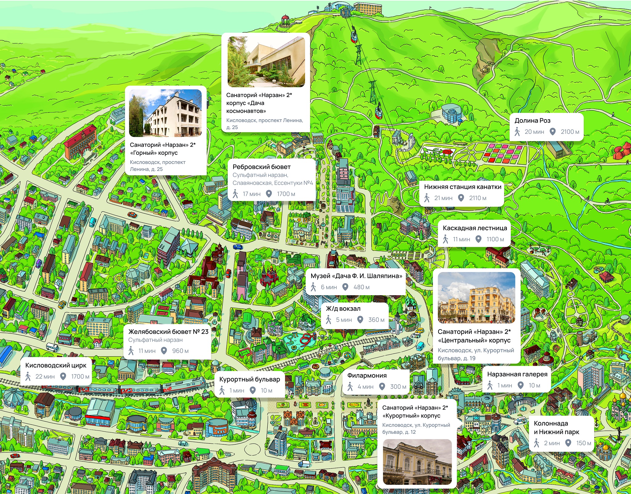 Санаторий «Нарзан» состоит из 4 корпусов, расположенных на расстоянии друг от друга. Гости, выбравшие заселение в корпусы №1 и №4 проживают поблизости от бюветов с минеральной водой и пешком добираются до Курортного парка. Корпус №3 расположен посреди Курортного парка рядом со станцией канатной дороги «Храм Воздуха». Жители корпуса №4 наслаждаются горным воздухом в окружении хвойного массива.