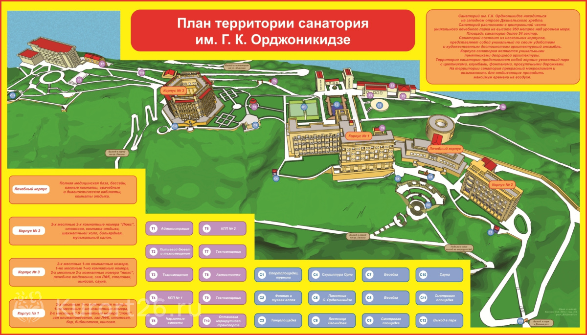 Cанаторий «им. Г. К. Орджоникидзе» находится на высоте 940 метров на склоне Джинальского хребта. Такое расположение позволит вам любоваться шикарными видами и наслаждаться чистейшим горным воздухом.