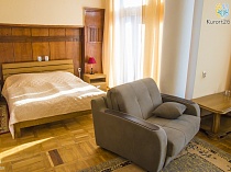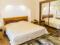 холодильник, телевизор, чайник, набор чайной посуды, балкон, ванные принадлежности, двуспальная кровать, набор мягкой мебели, ванная комната