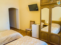 холодильник, телевизор, чайник, набор чайной посуды, балкон, санузел с душевой кабиной, односпальная кровать: 2 шт