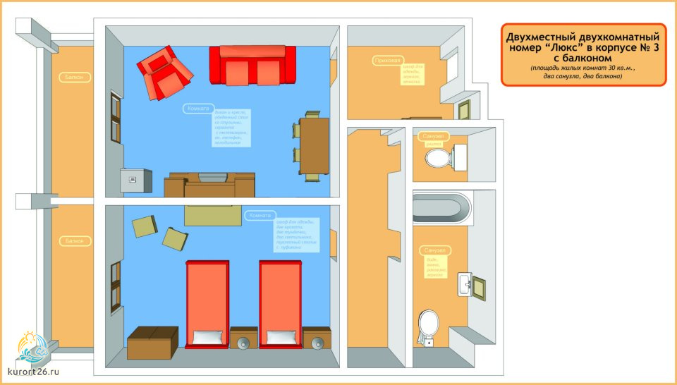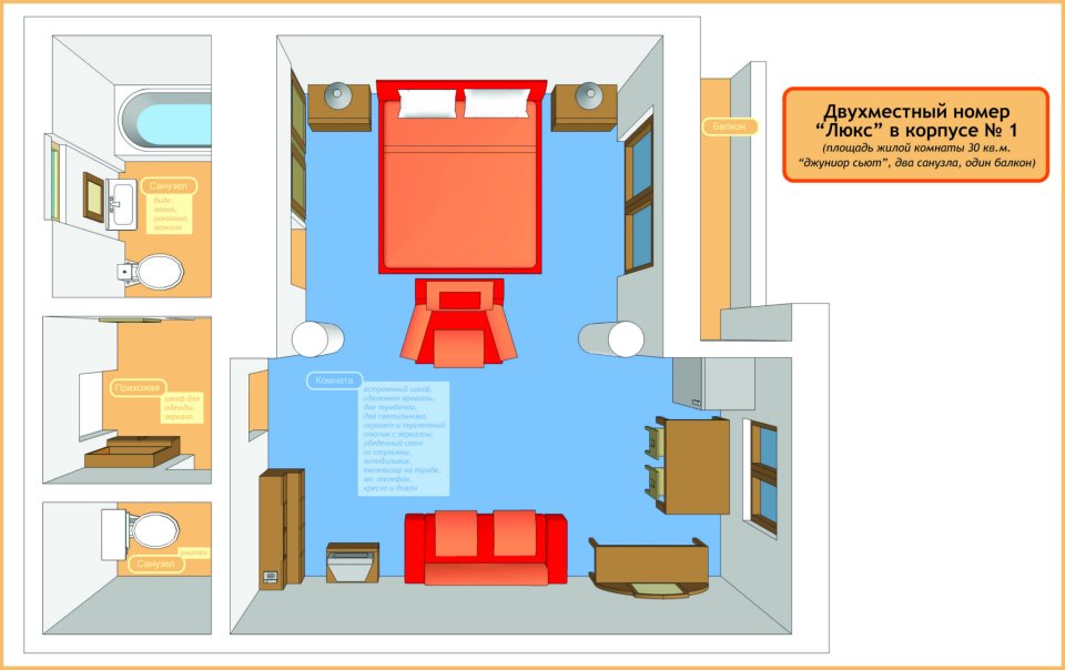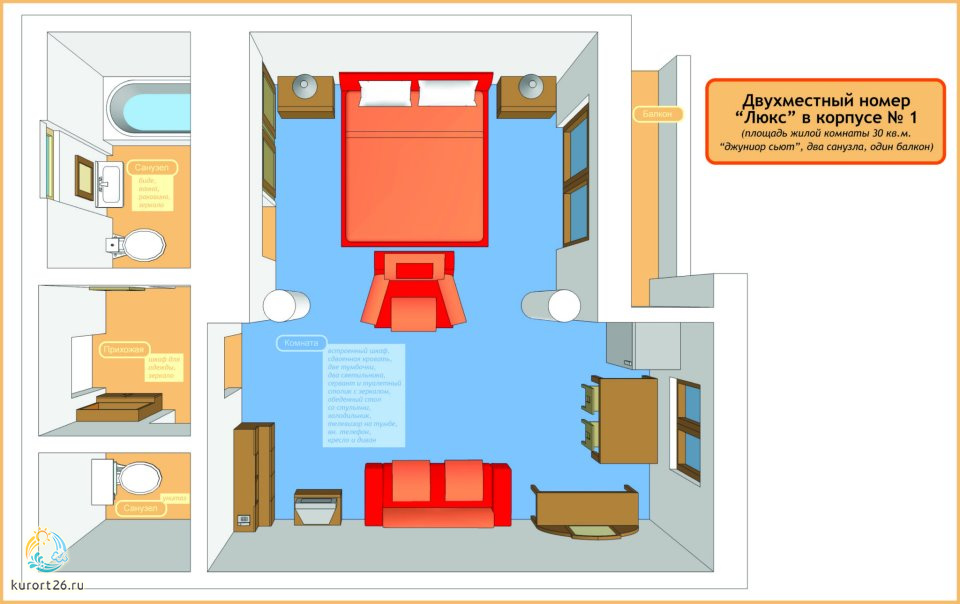 холодильник, телевизор, чайник, набор чайной посуды, балкон, ванные принадлежности, двуспальная кровать, набор мягкой мебели, ванная комната