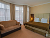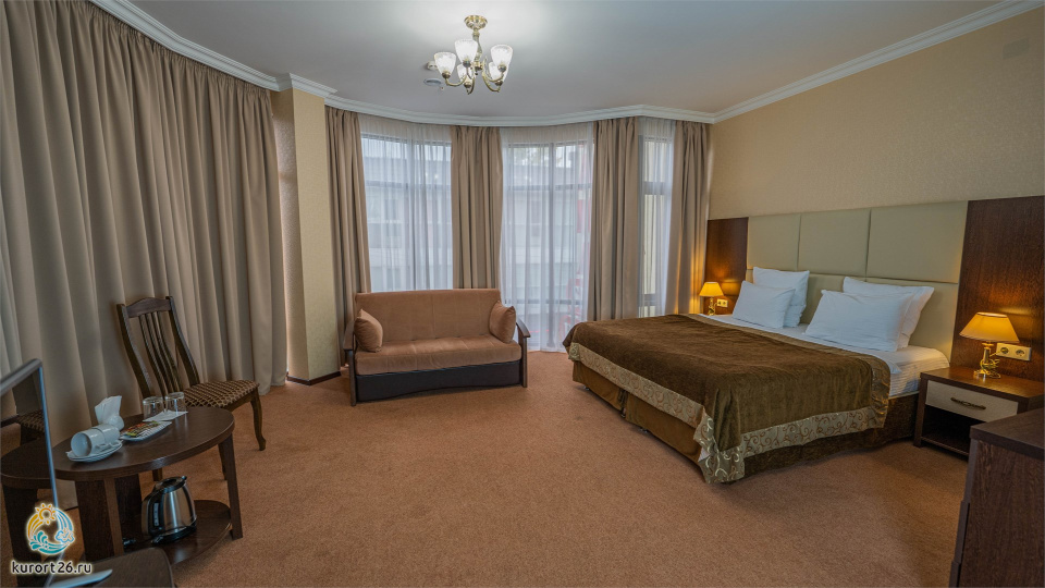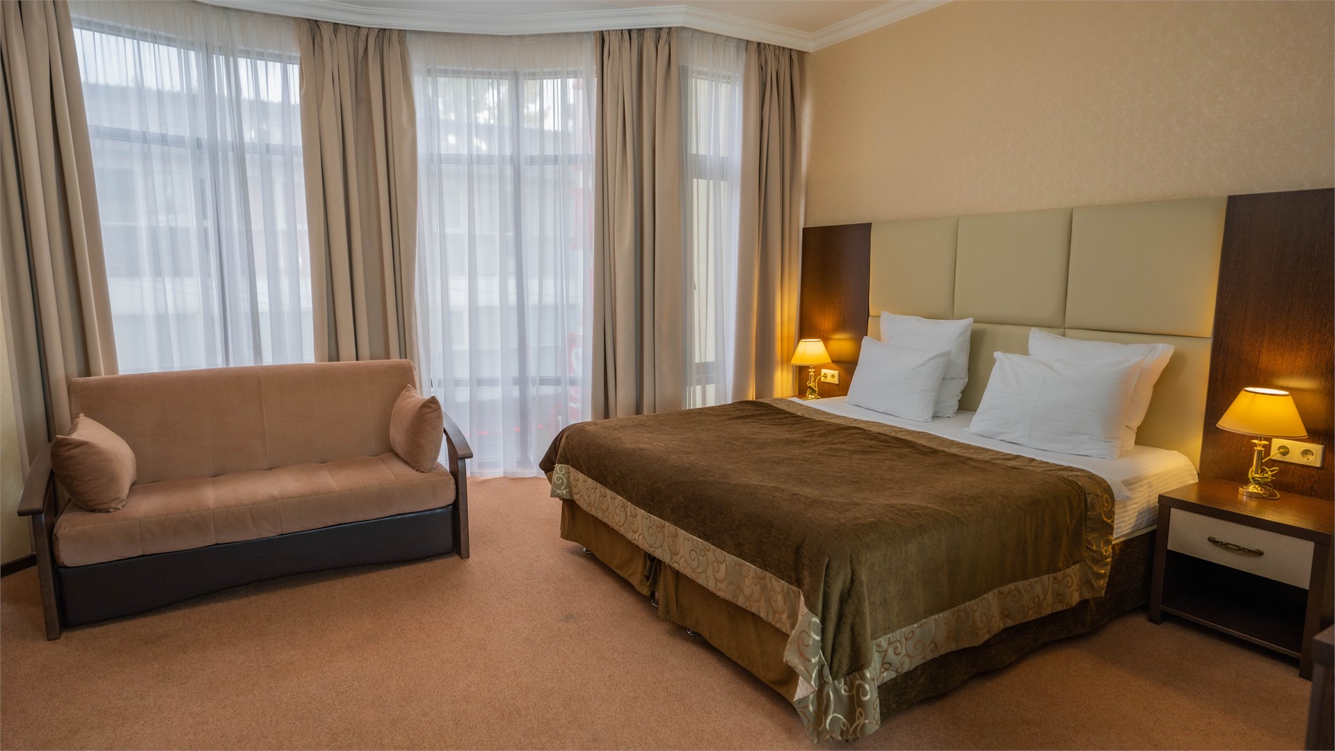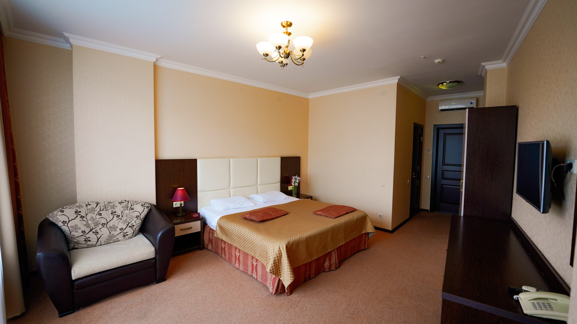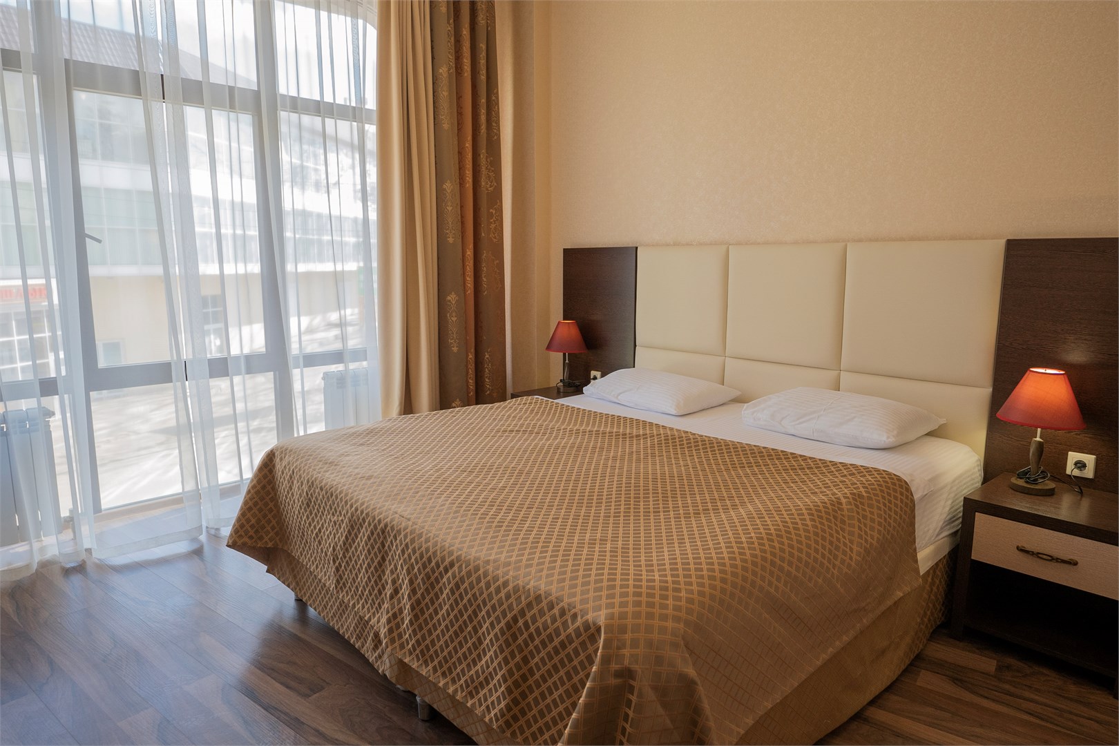 холодильник, фен, балкон, душ, телефон, тапочки, шкаф, обеденный стол, сплит-система, два телевизора, набор косметических средств, гостиная зона, Wi-Fi