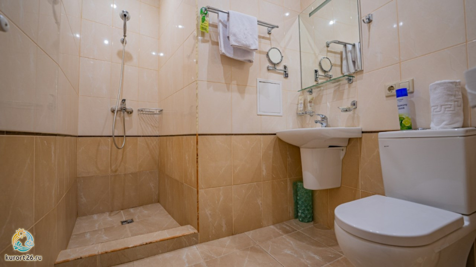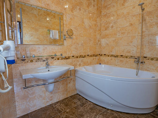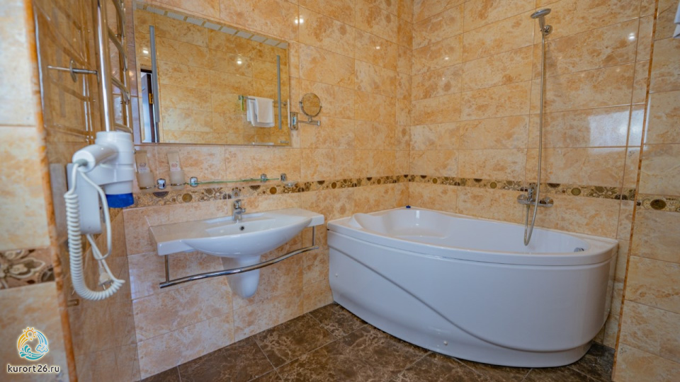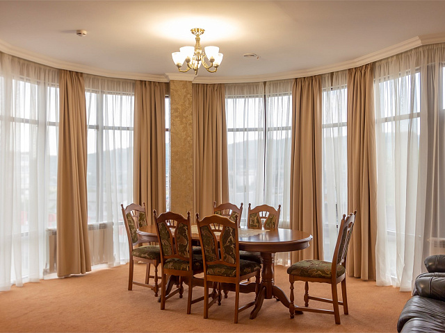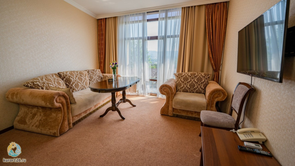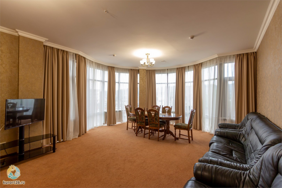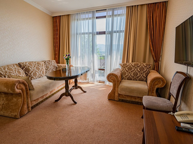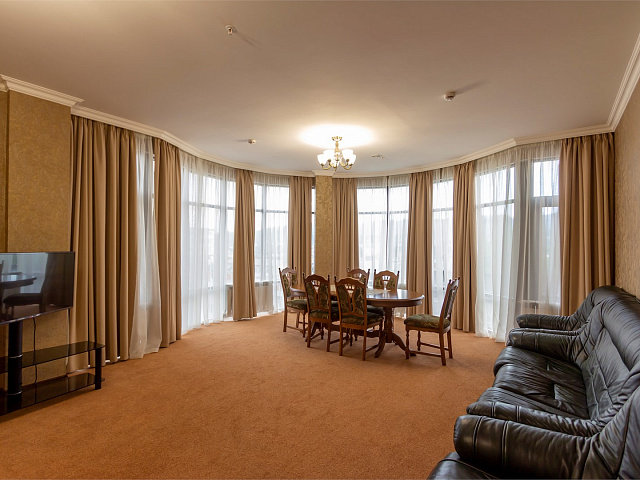 холодильник, фен, балкон, душ, телефон, тапочки, шкаф, обеденный стол, сплит-система, два телевизора, набор косметических средств, гостиная зона, Wi-Fi