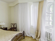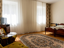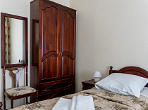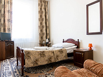 холодильник, телевизор, фен, душ, телефон, халат, двуспальная кровать, прикроватные тумбочки, шкаф-купе, диван, электрочайник, зеркало, два кресла, журнальный столик, стул, посуда, набор полотенец