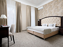 холодильник, чайник, фен, гладильная доска, сейф, тапочки, утюг с гладильной доской, сплит-система, кофемашина, халаты, набор косметических средств, чайный набор, 1 двухместная кровать и раскладной диван